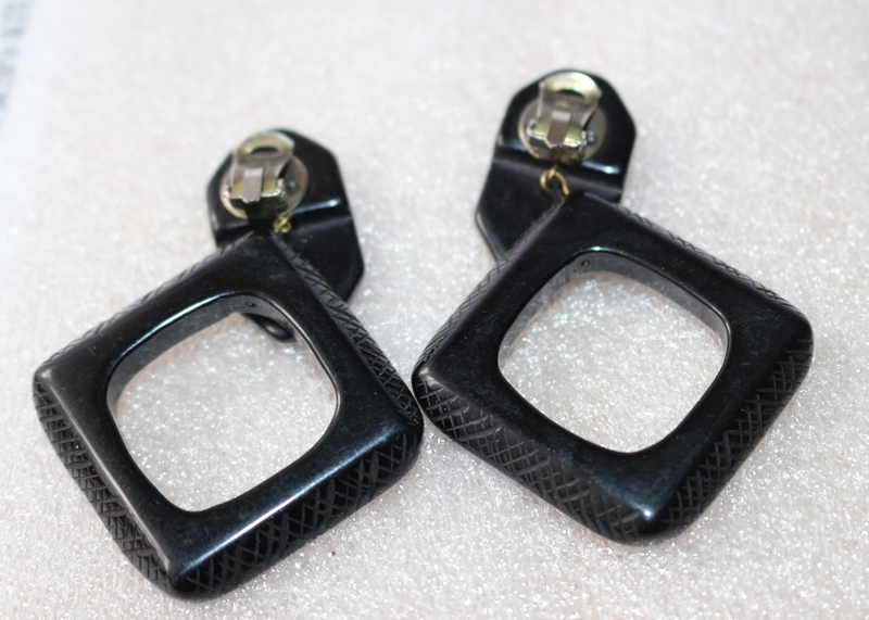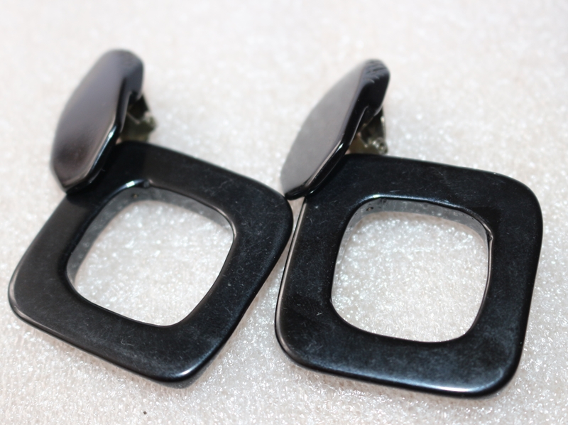 2 schwarze quadratische Ohrringe, Bakelit, Metallklemme, Höhe mit Schließe 8,0 cm, Breite 5,0 cm, Stärke 0,5 cm, 21,0 g
