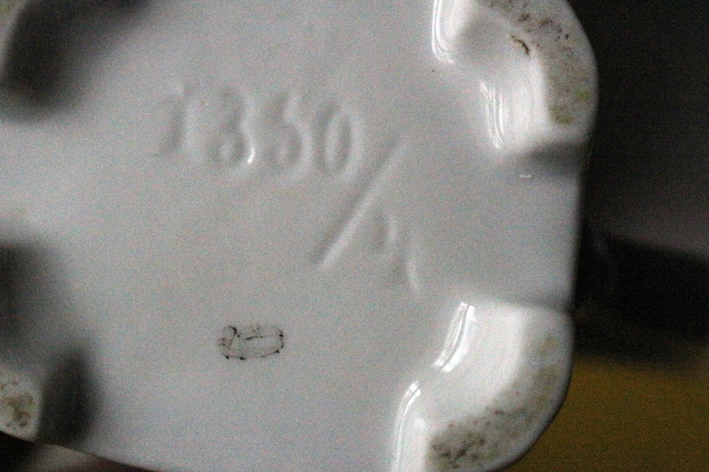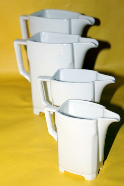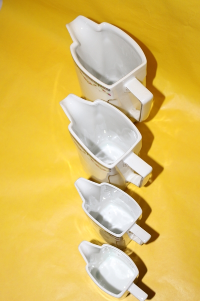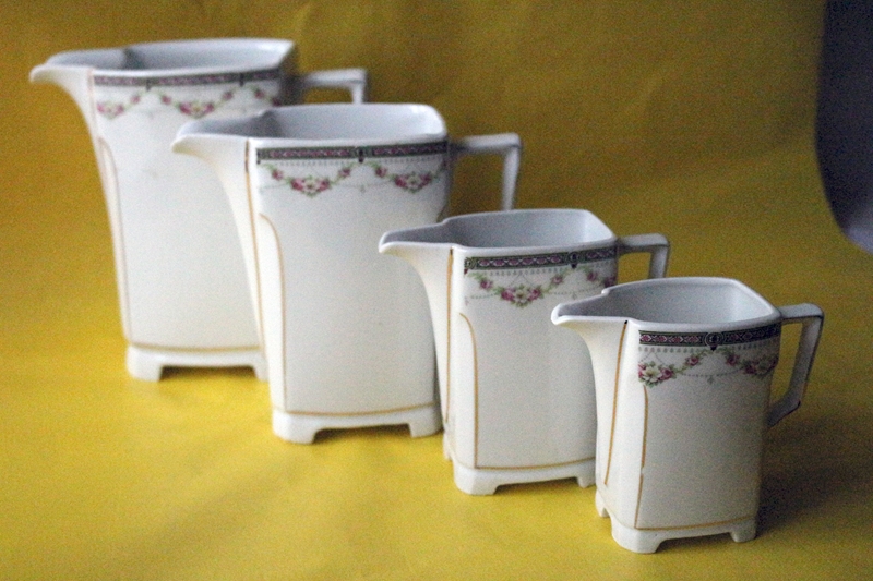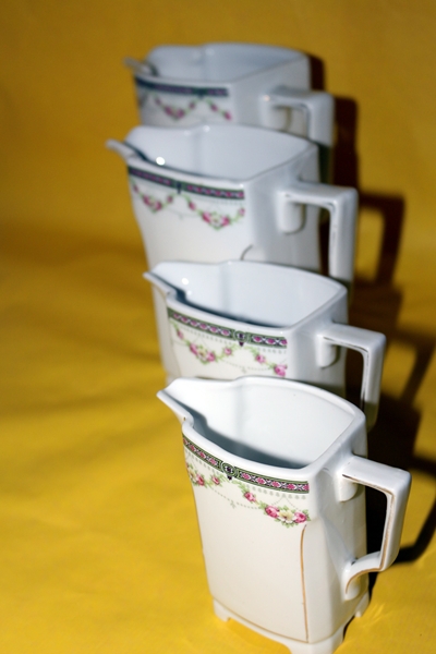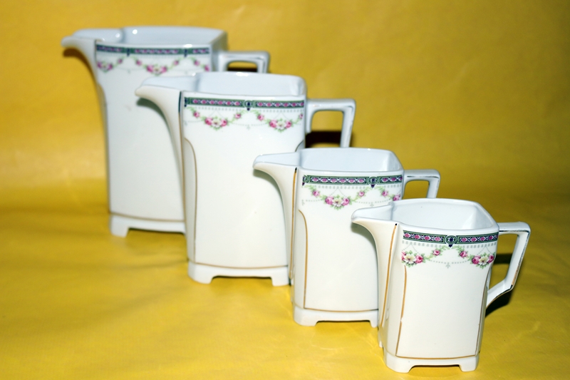 Porzellankannen im Jugendstil/Art Déco Übergangsstil, weiß mit rosafarbenen und grünen Blumengirlanden sowie Goldrändern, abgestufte Größen, Marke wohl eine "9", Nr. 1350/4, Maße von klein zu groß: 1. Ausguss bis Henkel 10,5 cm, Breite 5,0; Höhe 9,3 cm; 2. 11,5 x 5,2 x 10,5 cm; 3. 14,7 x 6,5 x 13,8 cm; 4. 16,0 x 7,8 x 15,6 cm
