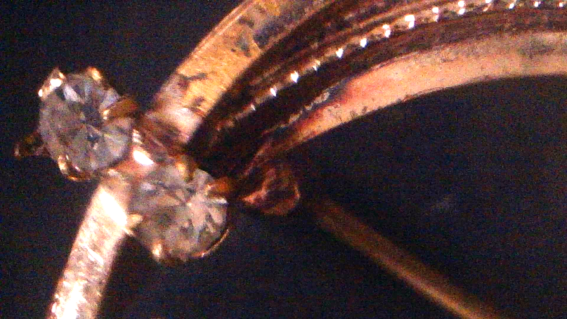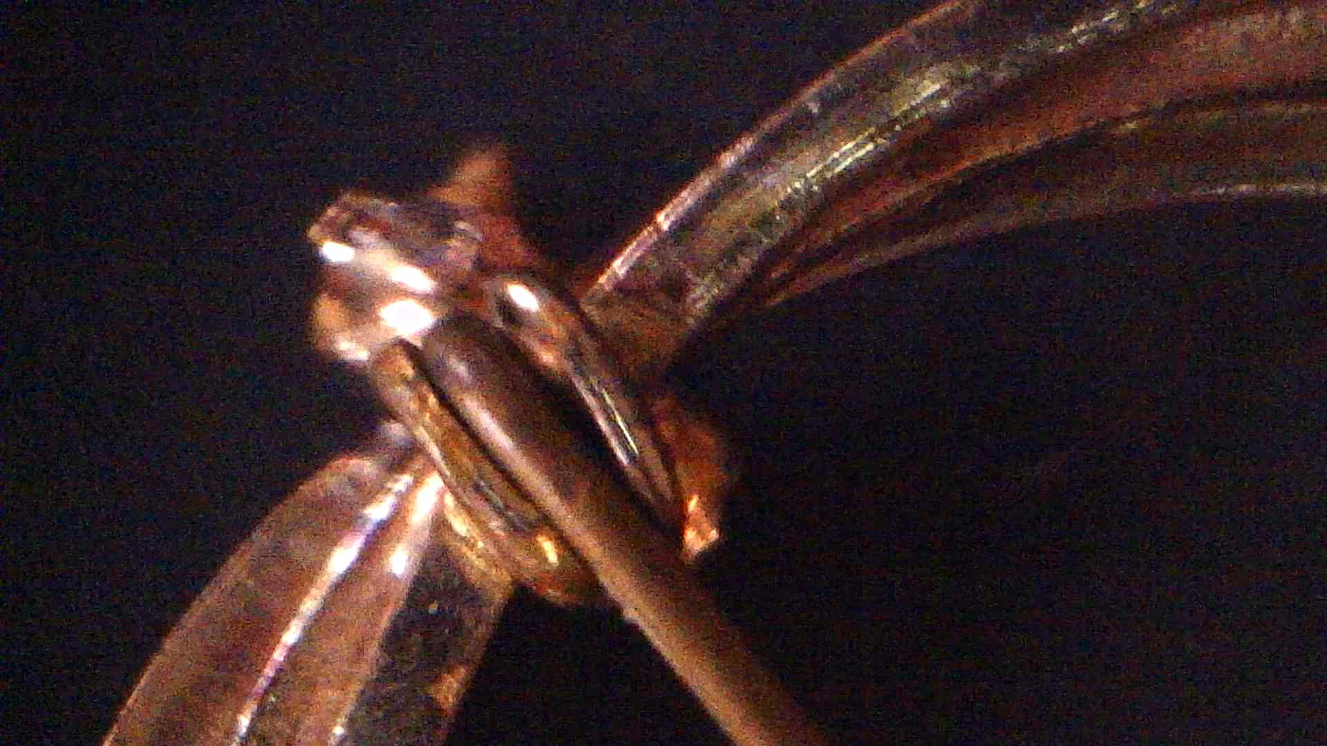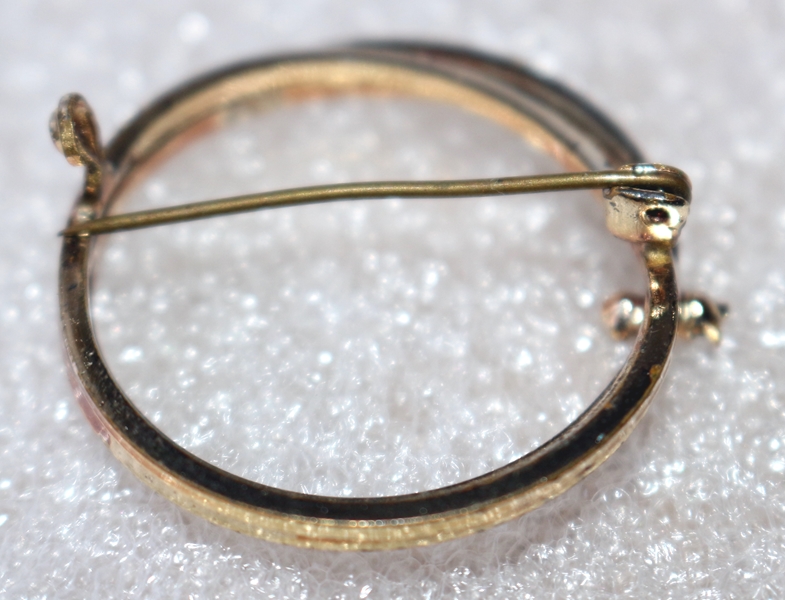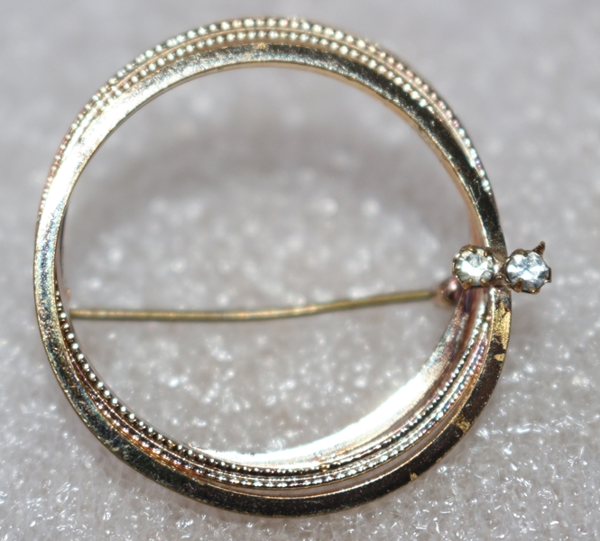 Modeschmuck, Anstecknadel mit drei Kreisen, goldfarben, 2 Kunstperlen, Innen-Dm 2,5; außen: 3,5 cm, 6,0 g