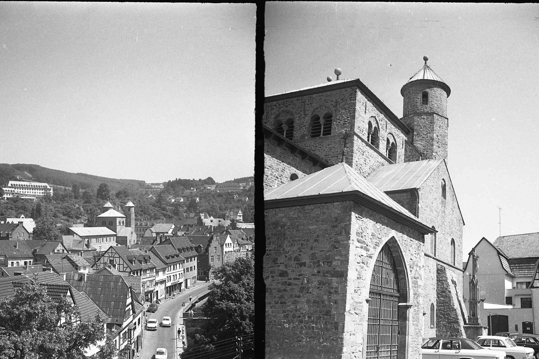 Original - Negativ, s/w, Kleinbild, 2 Aufnahmen: links eine Panoramaaufnahme von Bad Münstereifel, rechts die Stiftskirche St. Chrysanthus und Daria
