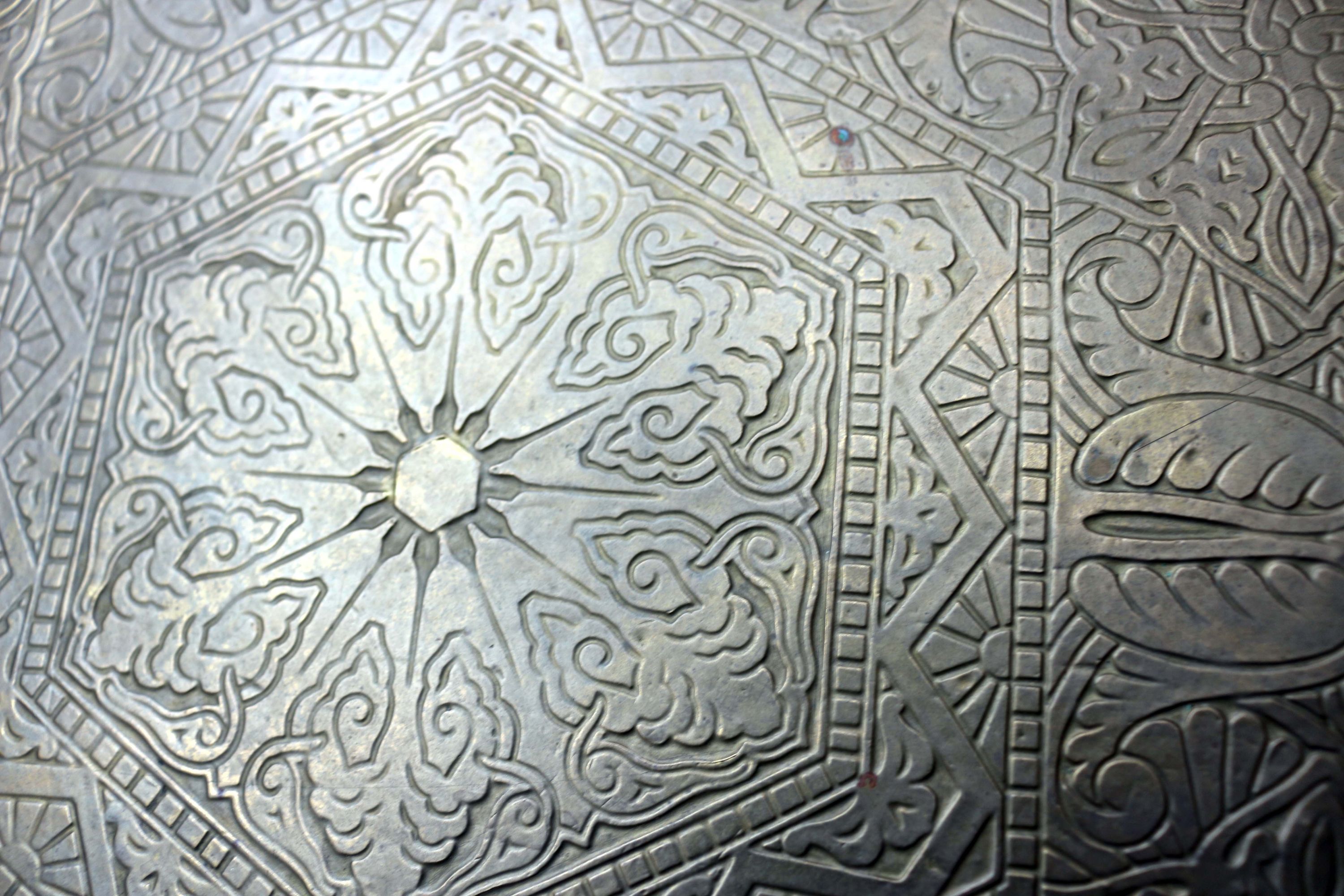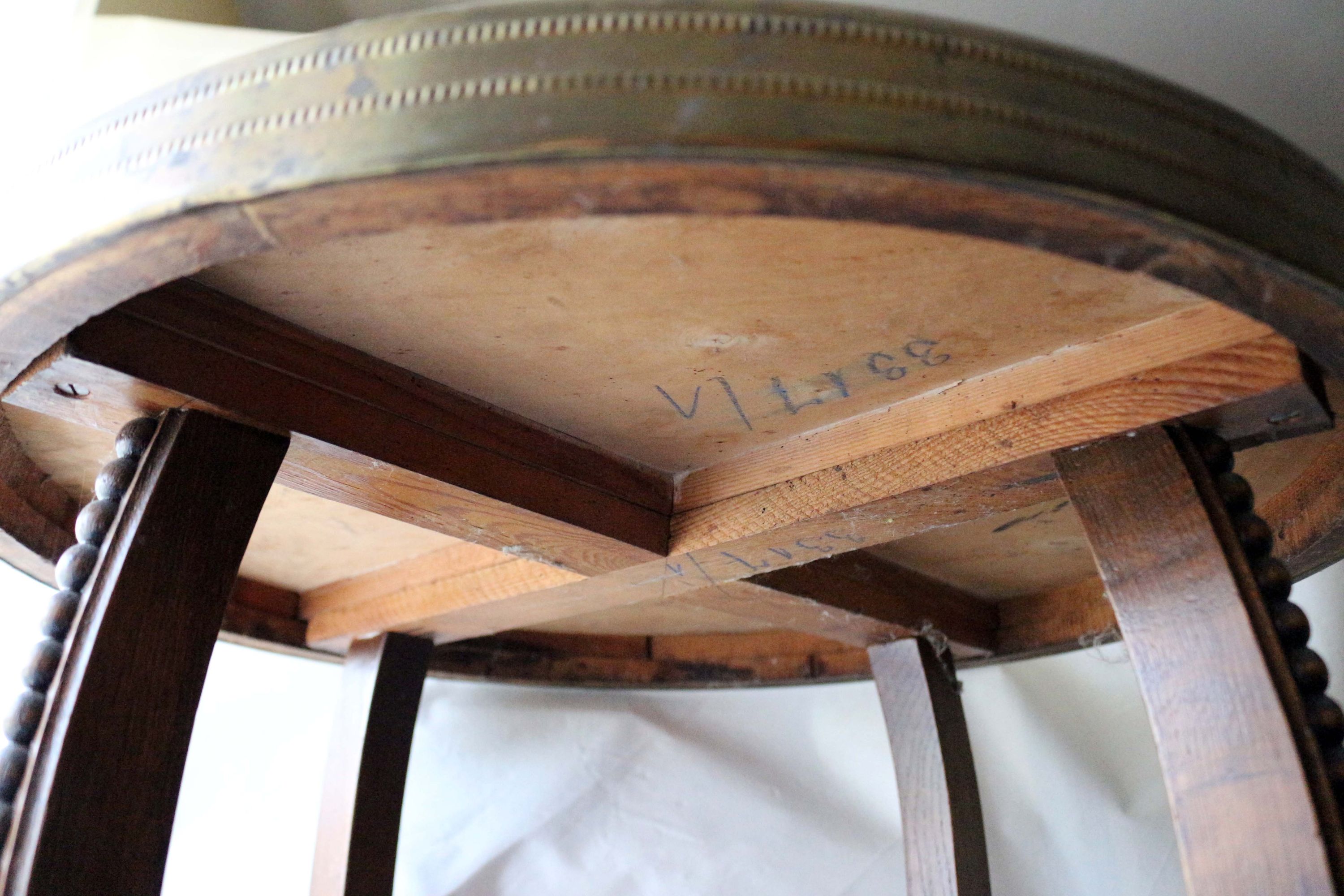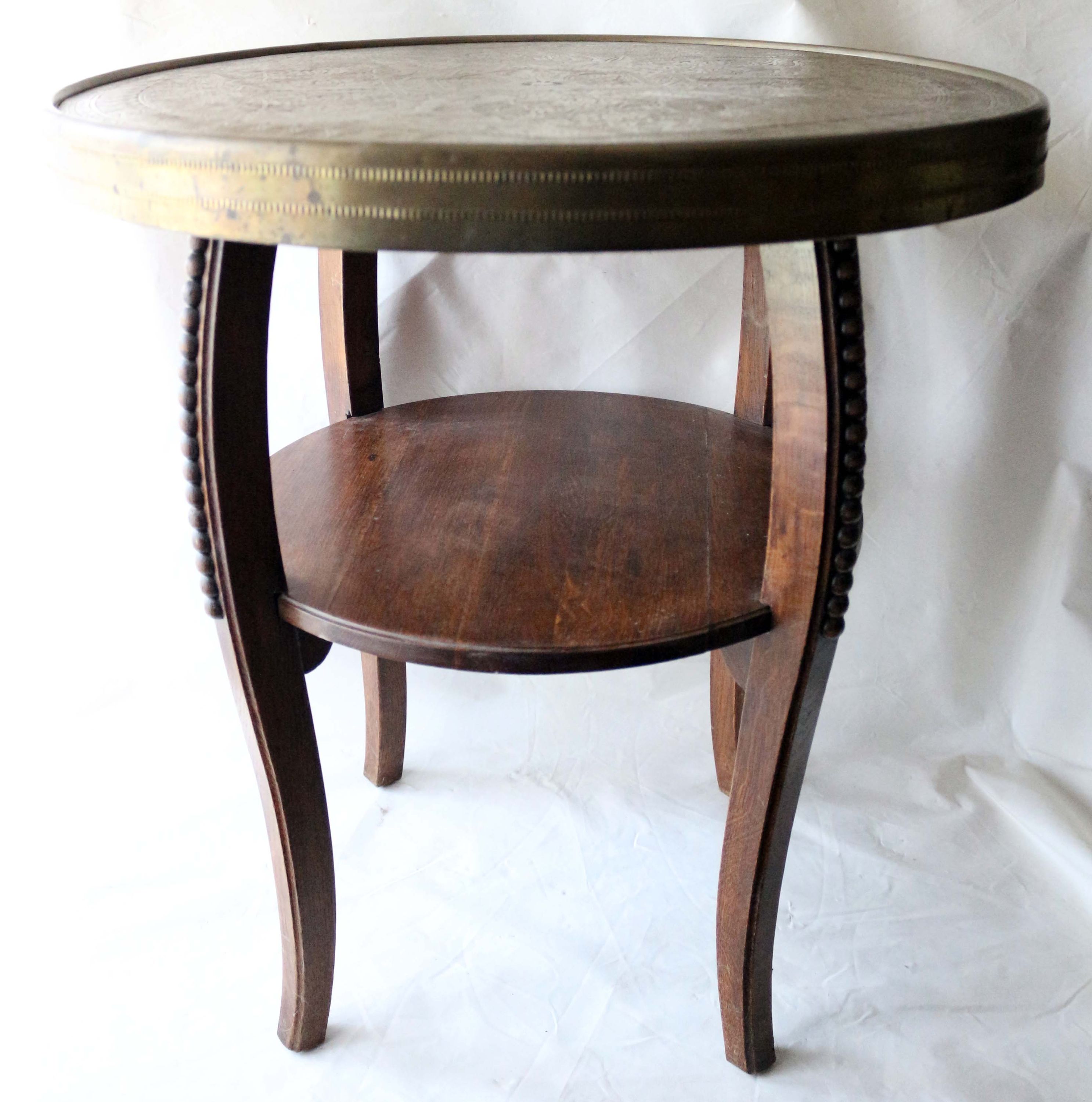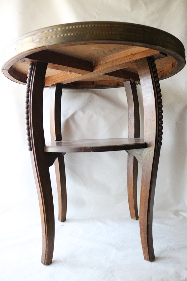 Rauchtisch oder Beistelltisch, aus der Zeit des Jugendstils oder Art Déco, Massivholz, mit einer markanten, verzierten und geprägten Messingplatte, dekorative geschwungene Beine mit Zierkugeln, zusätzliche Ablagefläche zwischen den Beinen, Tischhöhe 61,0 cm; Dm Tischplatte 59,5 cm; untere Ablage Höhe: 33,0 cm; Breite Messingrand 4,5 cm