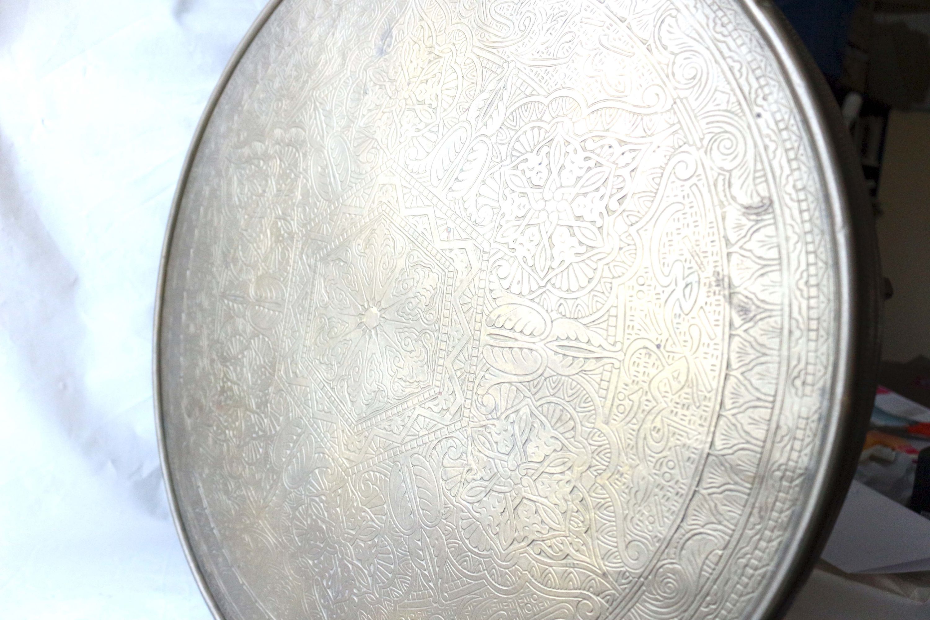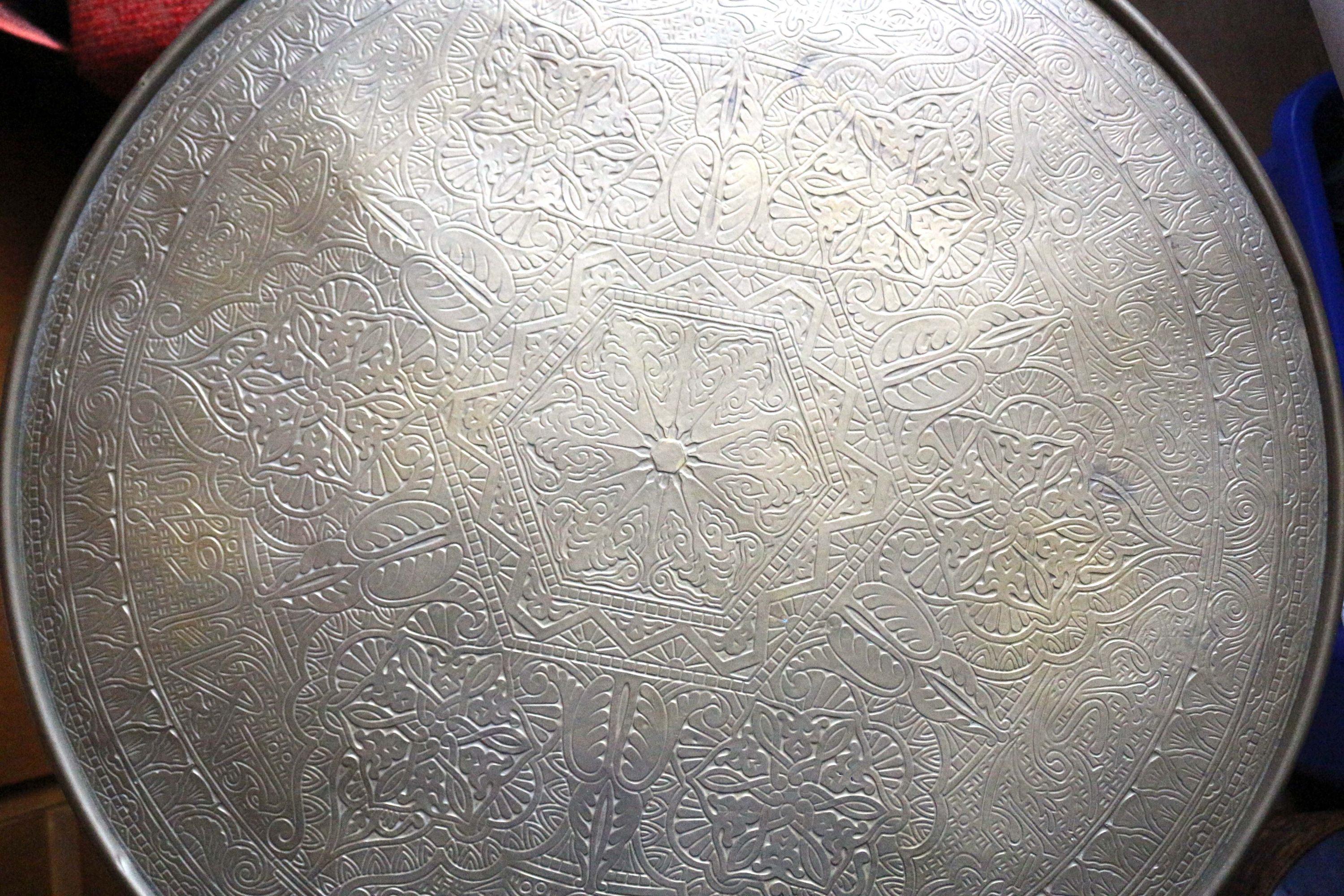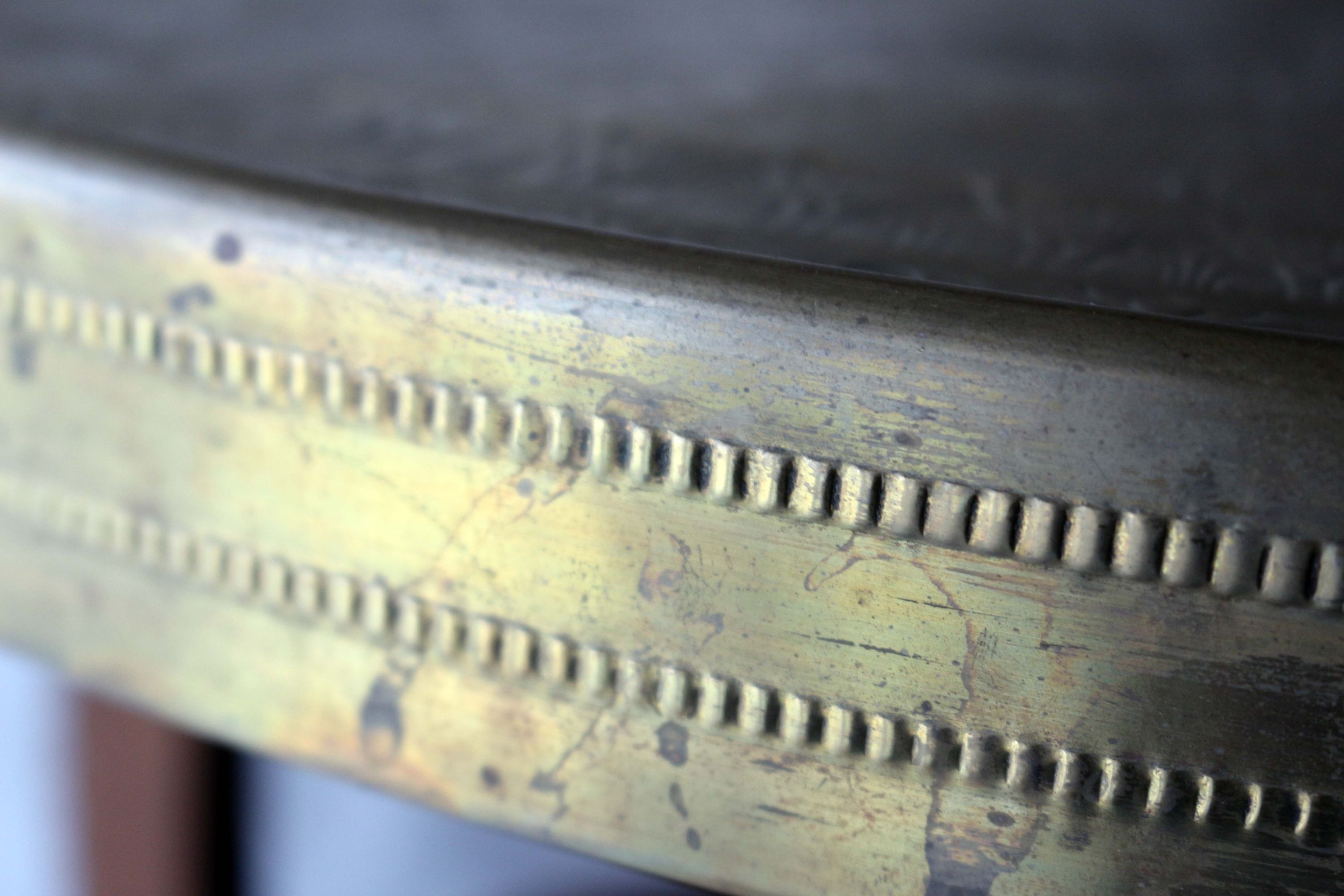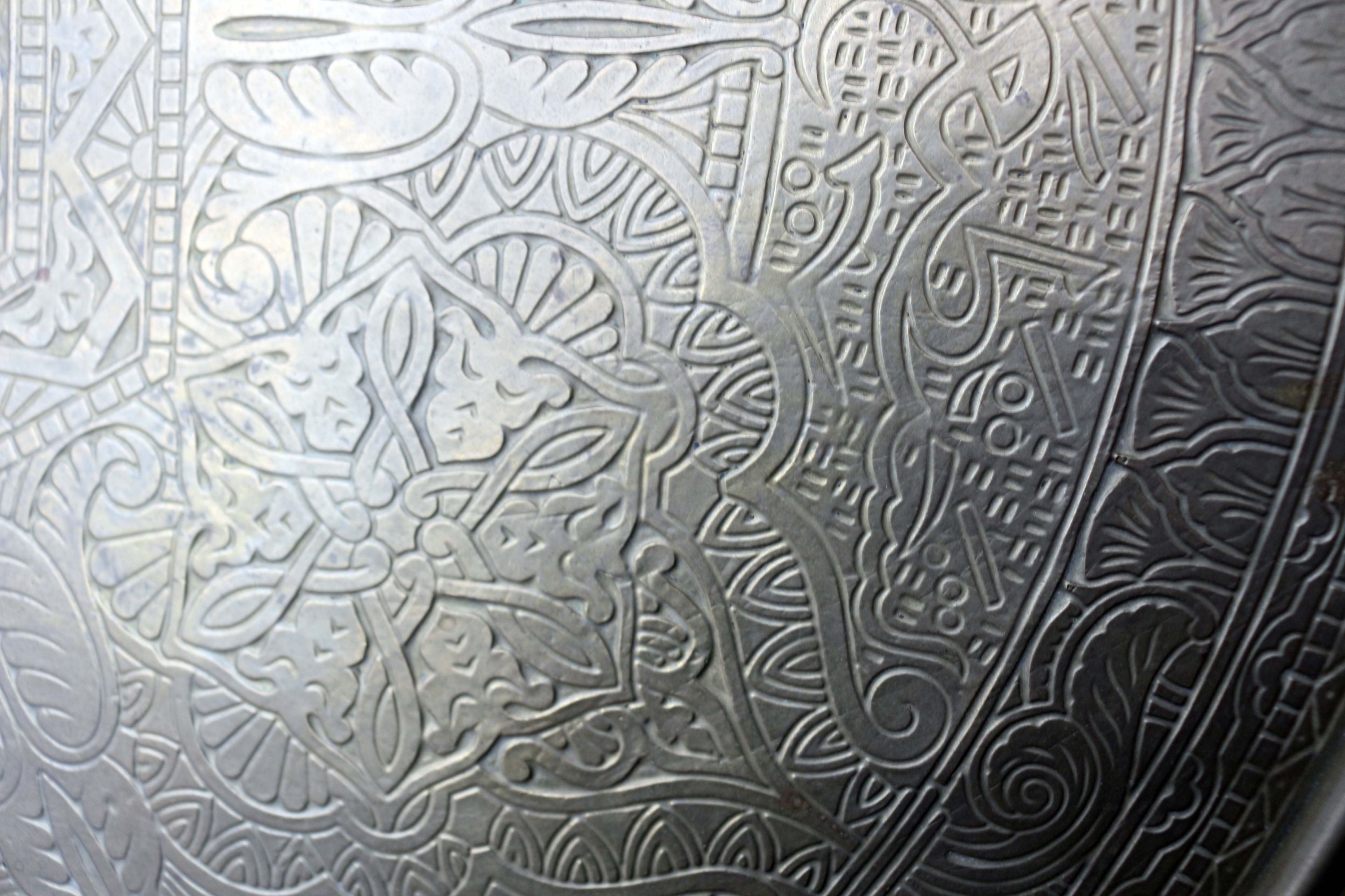 Rauchtisch oder Beistelltisch, aus der Zeit des Jugendstils oder Art Déco, Massivholz, mit einer markanten, verzierten und geprägten Messingplatte, dekorative geschwungene Beine mit Zierkugeln, zusätzliche Ablagefläche zwischen den Beinen, Tischhöhe 61,0 cm; Dm Tischplatte 59,5 cm; untere Ablage Höhe: 33,0 cm; Breite Messingrand 4,5 cm