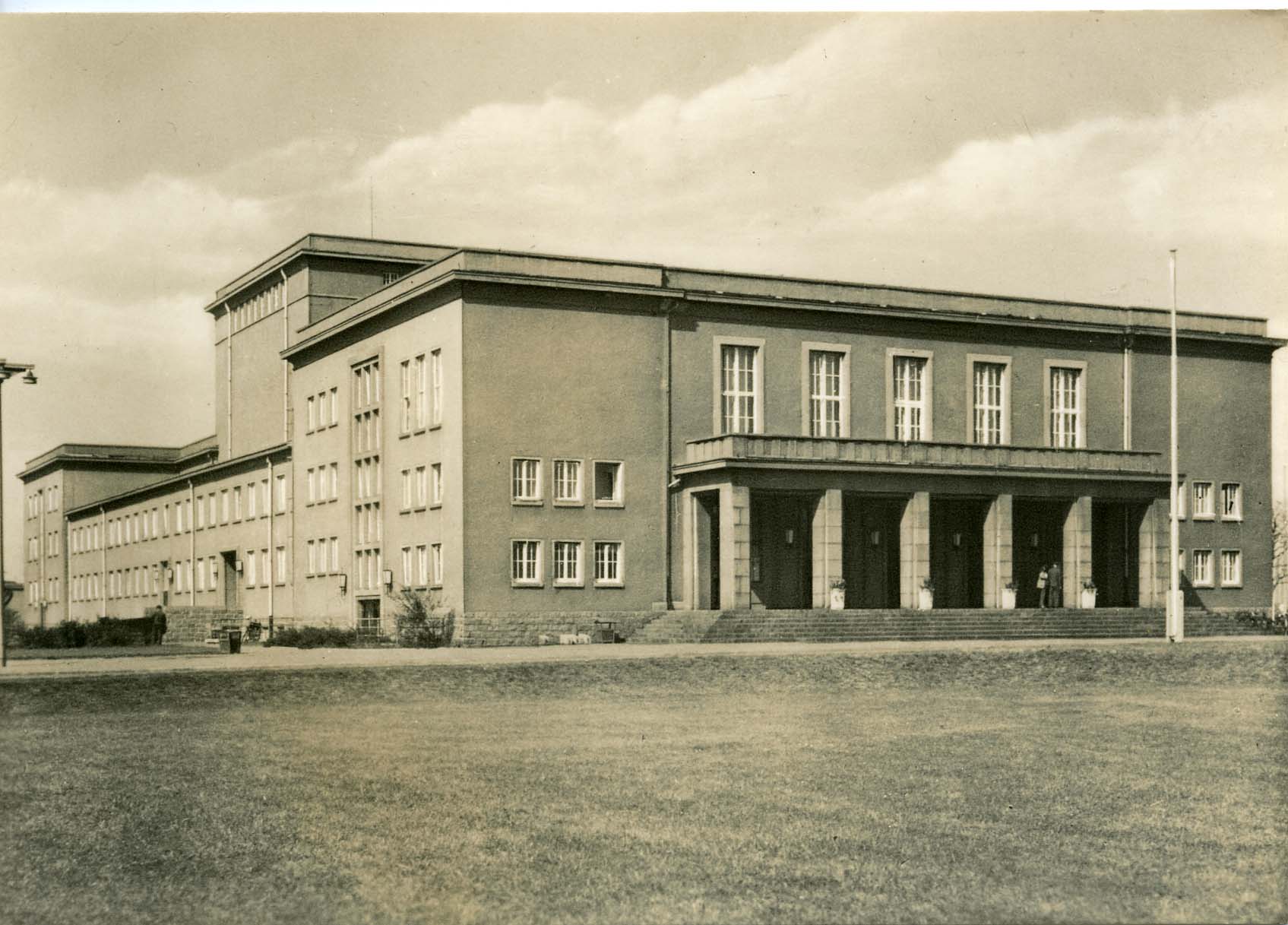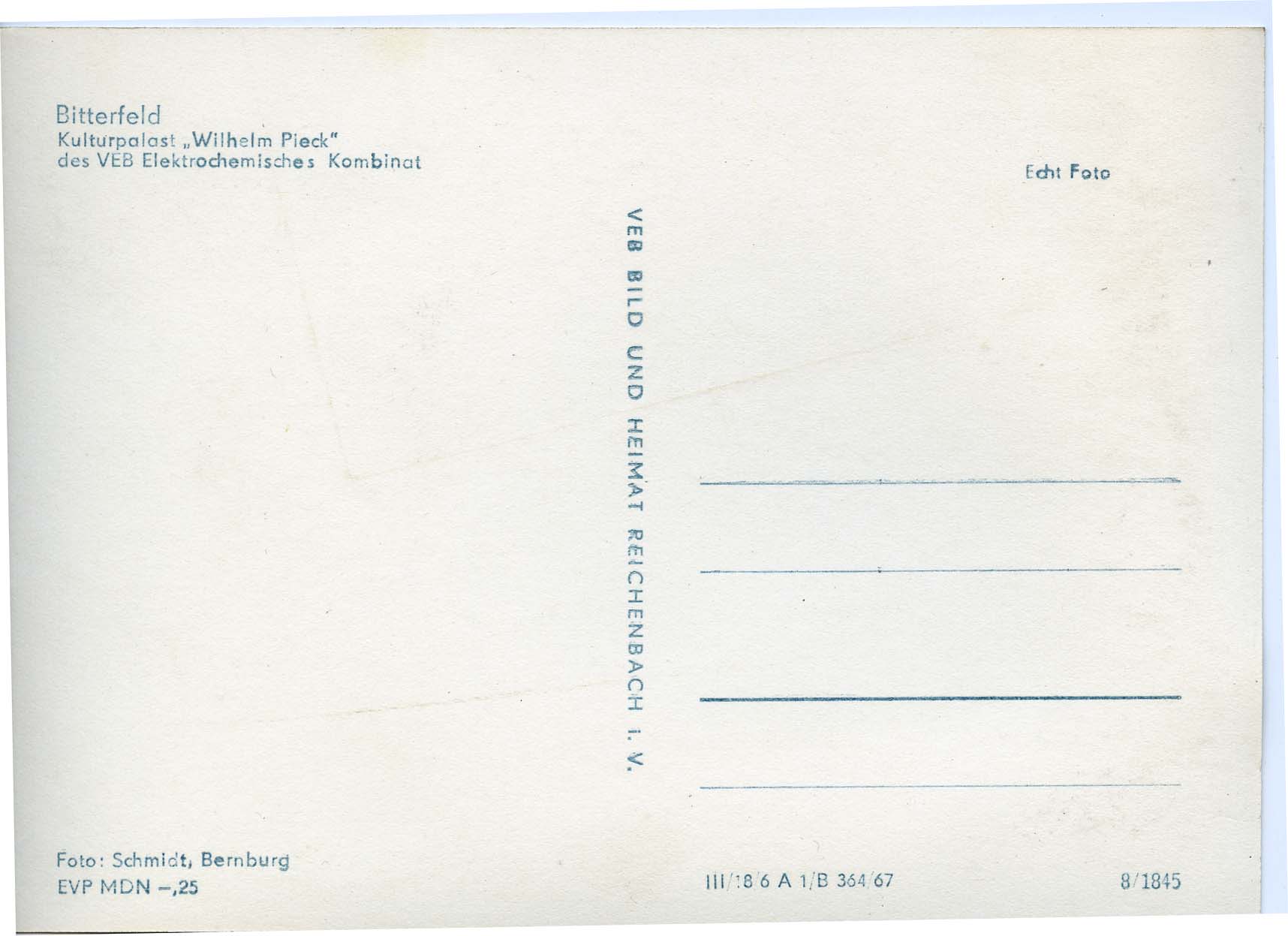 AK/Postkarte Bitterfeld - Kulturpalast "Wilhelm Pieck" des VEB Elektrochemischen Kombinats, VEB Bild und Heimat Reichenbach, beschrieben, gelaufen, mit Briefmarke und Stempel, Maße 10,0 x 14,4 cm