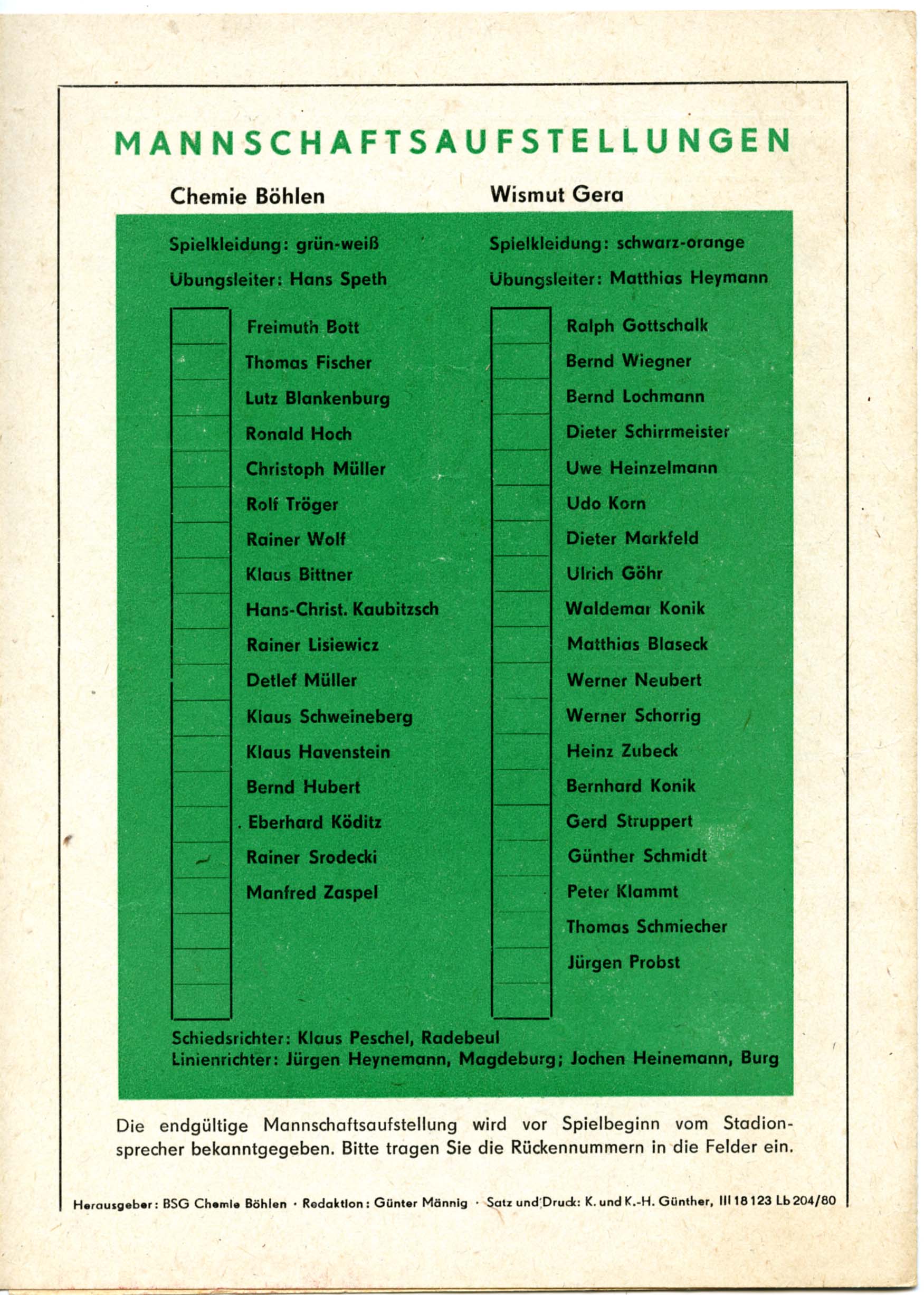 Fußball, Spieltag der Aufstiegsrunde, Sonntag, den 11. Mai 1980, 15.00 Uhr, Stadion an der Jahnbaude, mit Bildern, Tabellen und Texten sowie voraussichtliche Aufstellungen, 8 Seiten