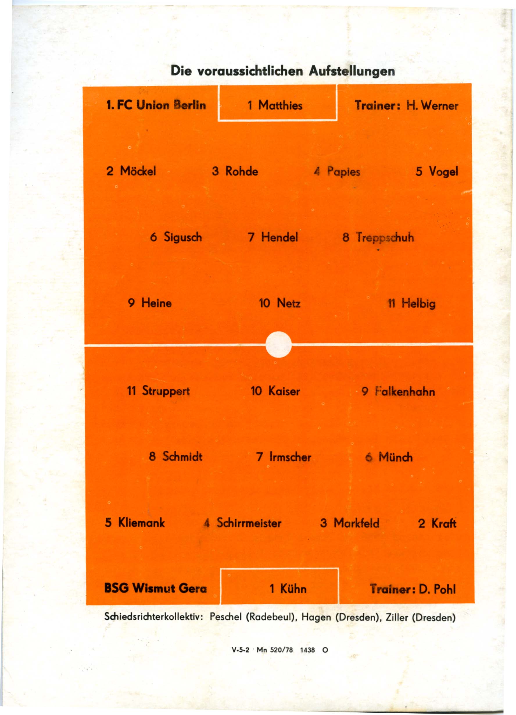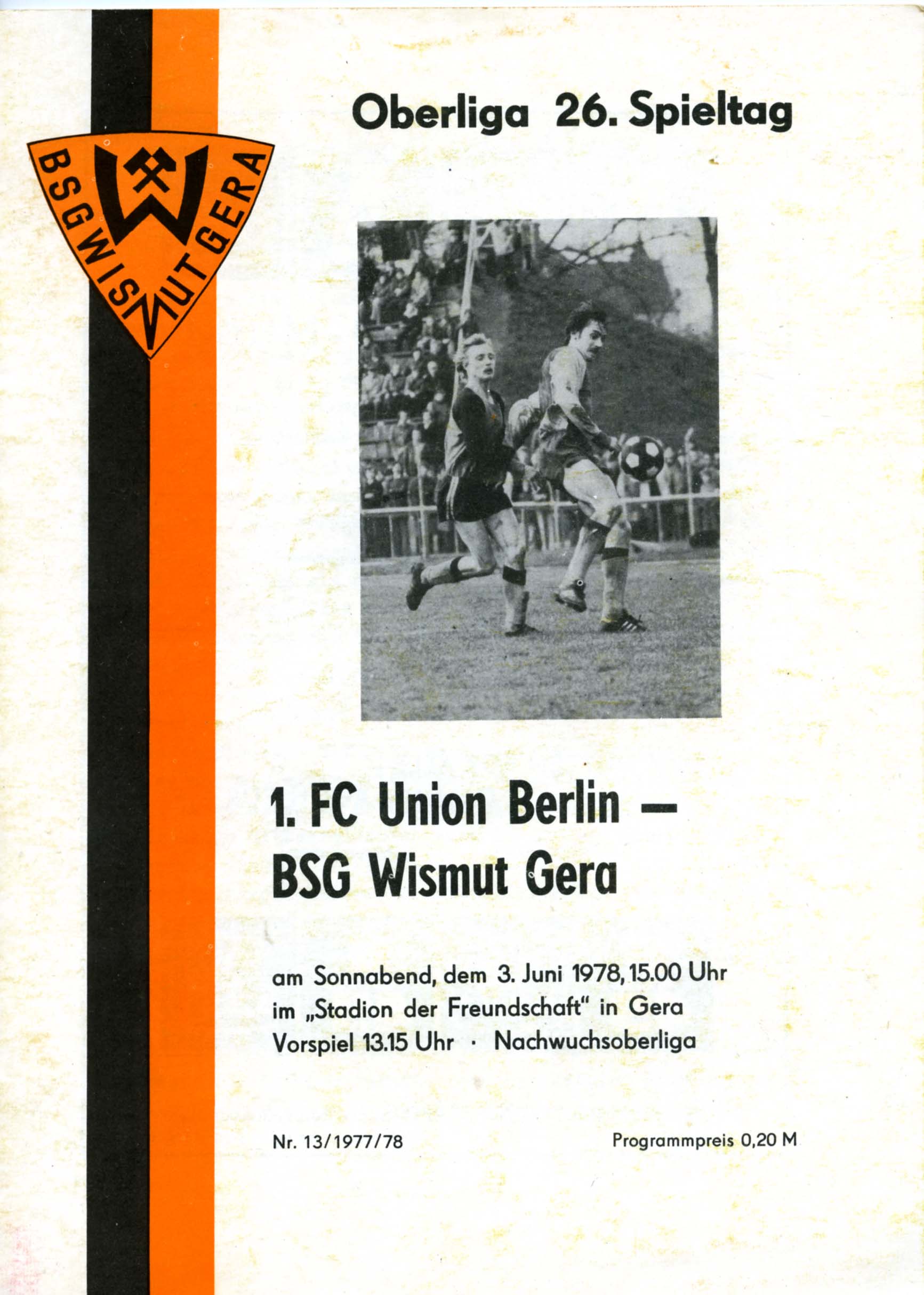 Fußball Oberliga, 26. Spieltag, Nr. 13, Spielzeit 1977/78, 03. Juni 1978, 15.00 Uhr, Stadion der Freundschaft in Gera, mit Tabellen und Texten sowie voraussichtliche Aufstellungen, 4 Seiten, 20,5 x 14,7 cm