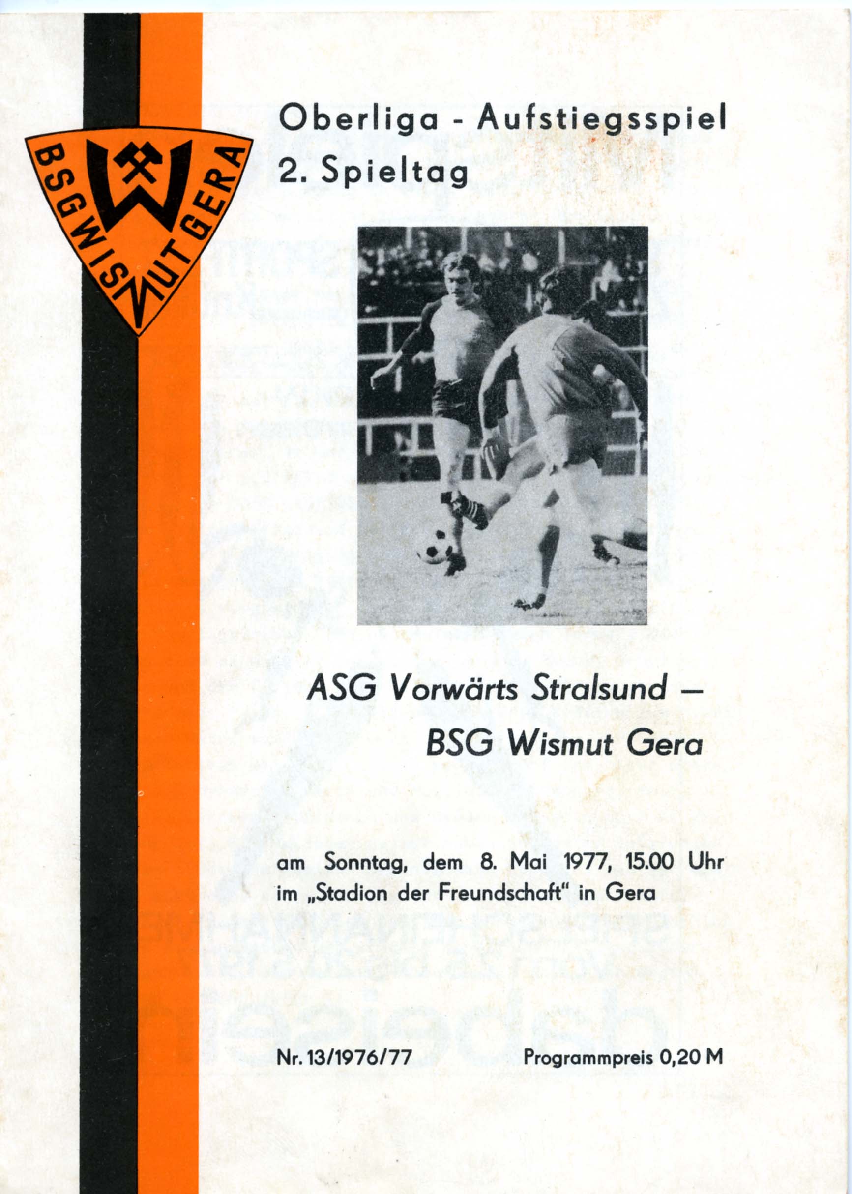 Fußball Oberliga-Aufstiegsspiel, 2. Spieltag, Nr. 13, Spielzeit 1976/77, 08. Mai 1977, 15.00 Uhr, Stadion der Freundschaft in Gera, mit Tabellen und Texten sowie voraussichtliche Aufstellungen, 4 Seiten, 20,5 x 14,7 cm