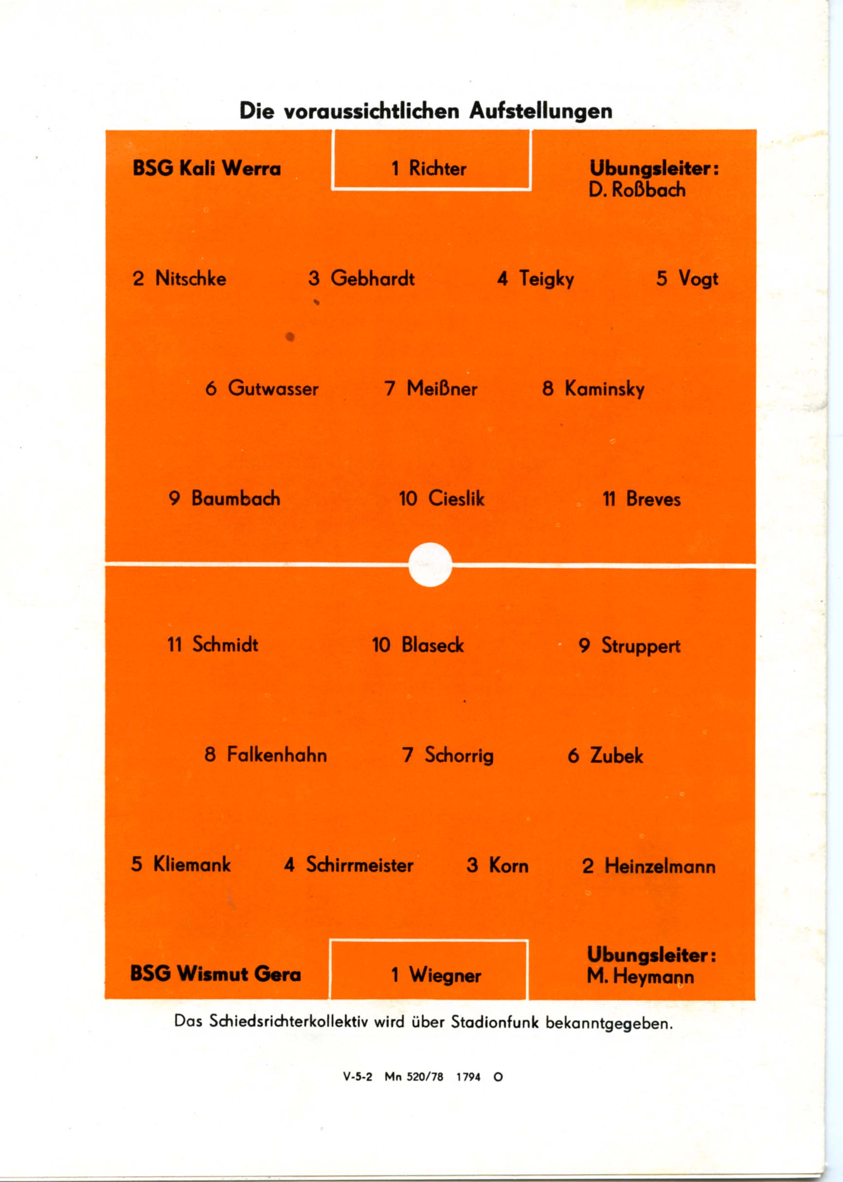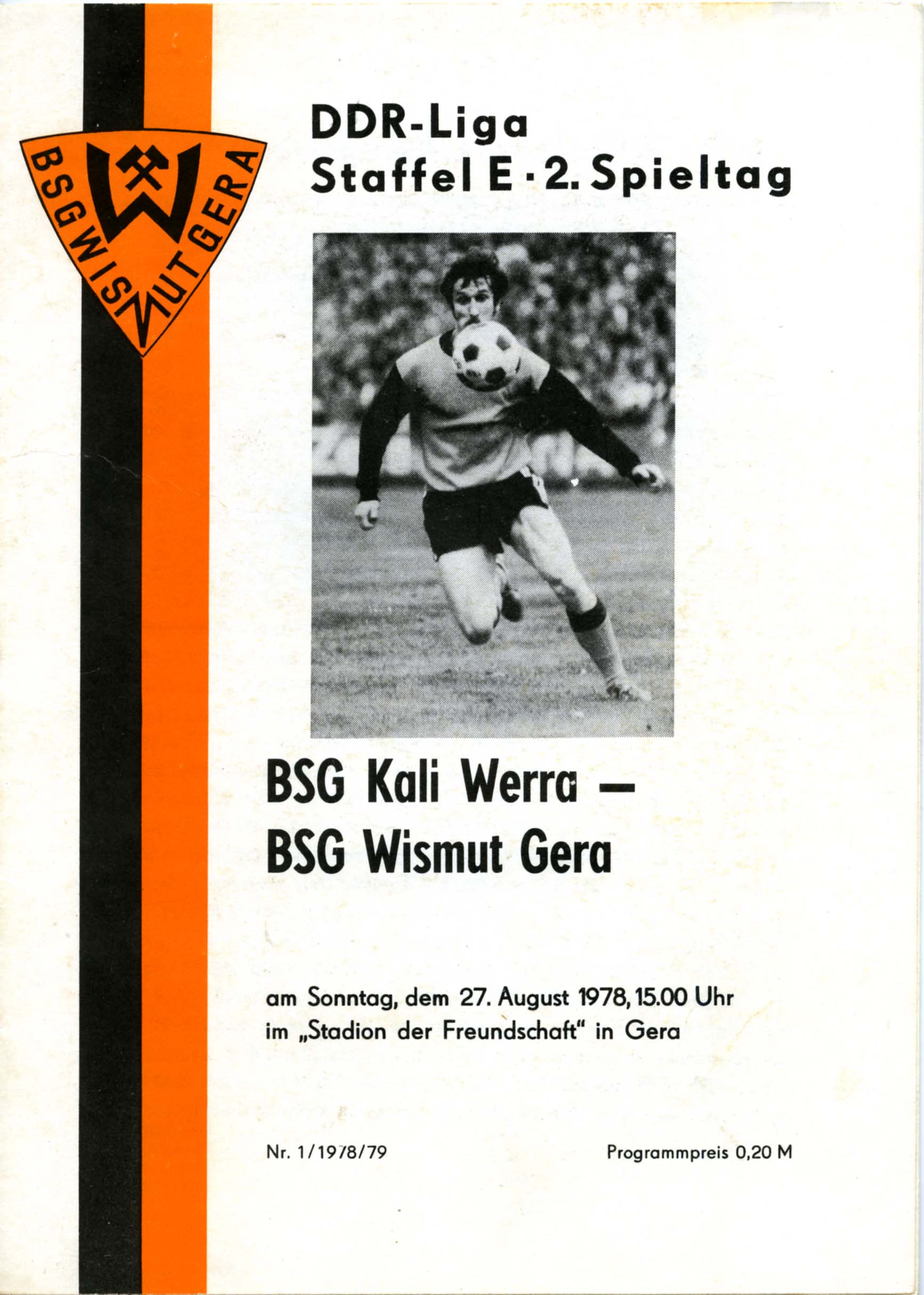 Fußball DDR-Liga, Staffel E, 2. Spieltag, Nr. 1, Spielzeit 1978/79, 27.08. 1978, 15.00 Uhr, Stadion der Freundschaft in Gera, mit Tabellen und Texten sowie voraussichtliche Aufstellungen, 4 Seiten, 20,5 x 14,7 cm
