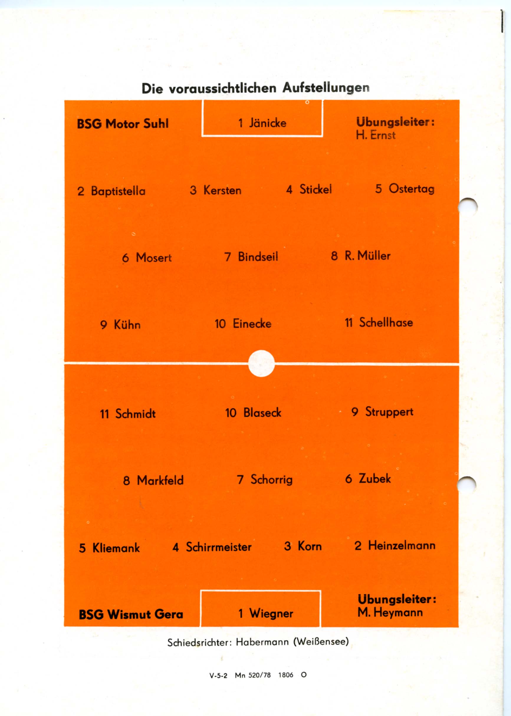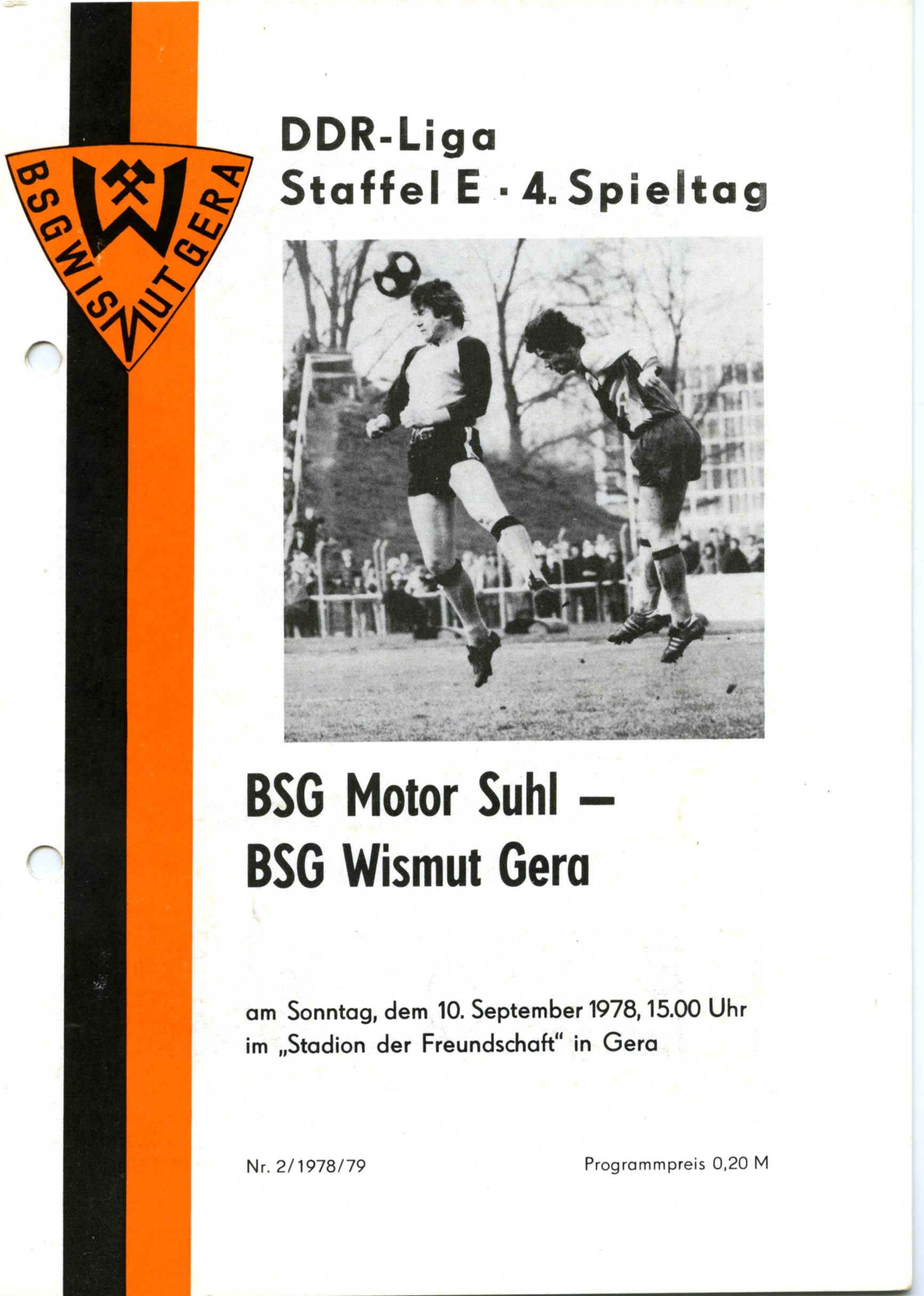 Fußball DDR-Liga, Staffel E, 4. Spieltag, Nr. 2, Spielzeit 1978/79, 10.09. 1978, 15.00 Uhr, Stadion der Freundschaft in Gera, mit Tabellen und Texten sowie voraussichtliche Aufstellungen, 4 Seiten, 20,5 x 14,7 cm