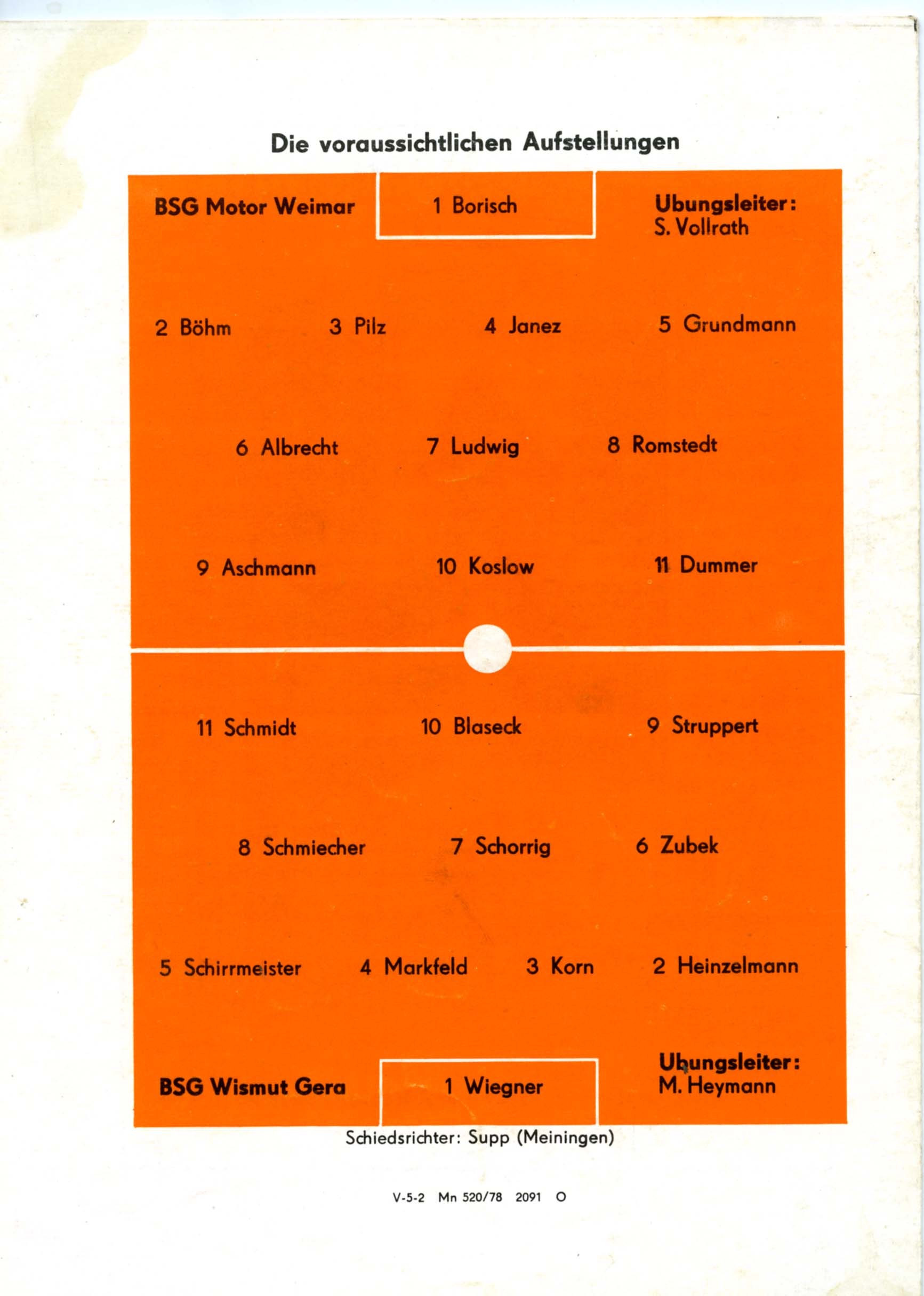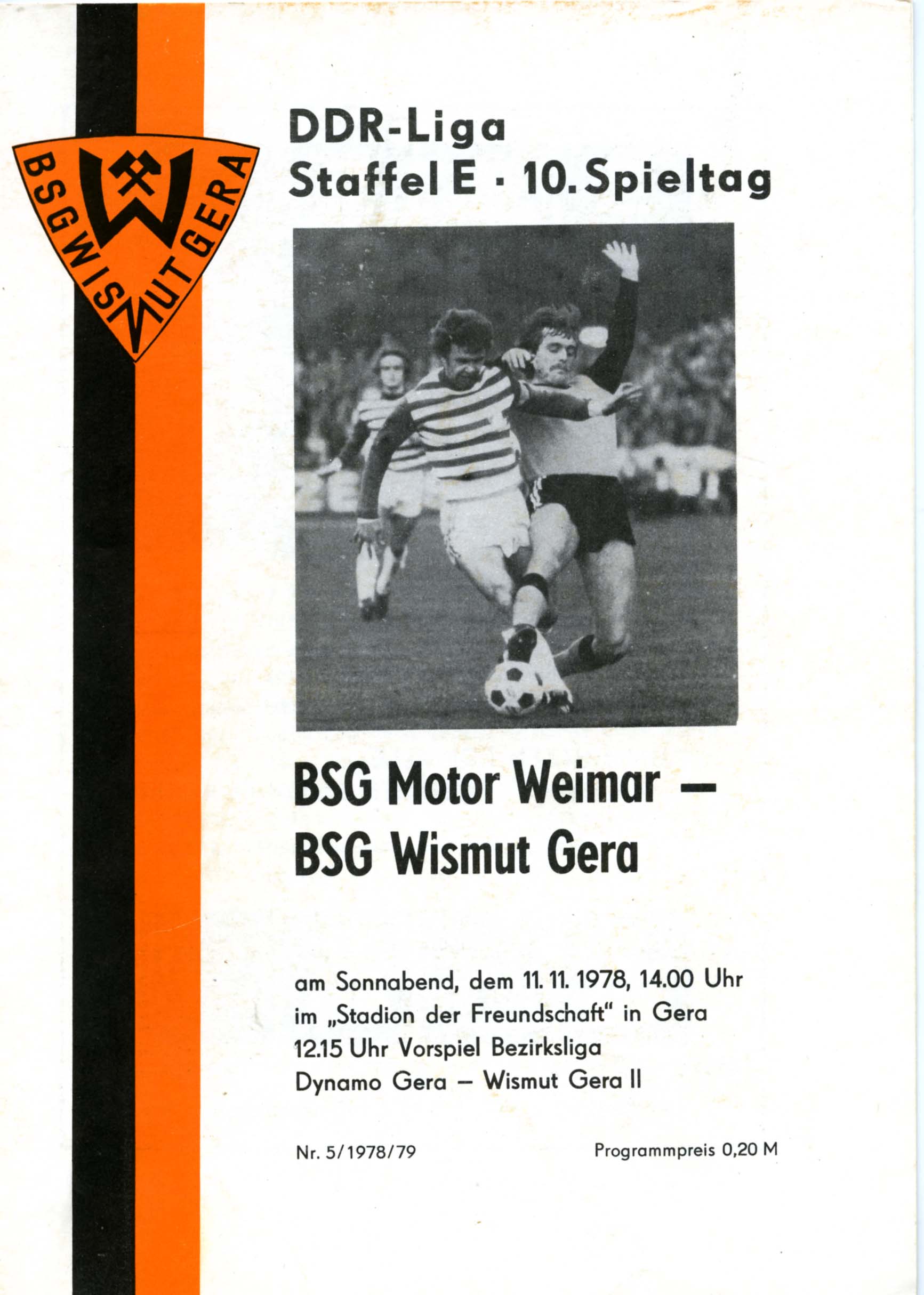 Fußball DDR-Liga, Staffel E, 10. Spieltag, Nr. 5, Spielzeit 1978/79, 11.11. 1978, 14.00 Uhr, Stadion der Freundschaft in Gera, mit Tabellen und Texten sowie voraussichtliche Aufstellungen, 4 Seiten, 20,5 x 14,7 cm