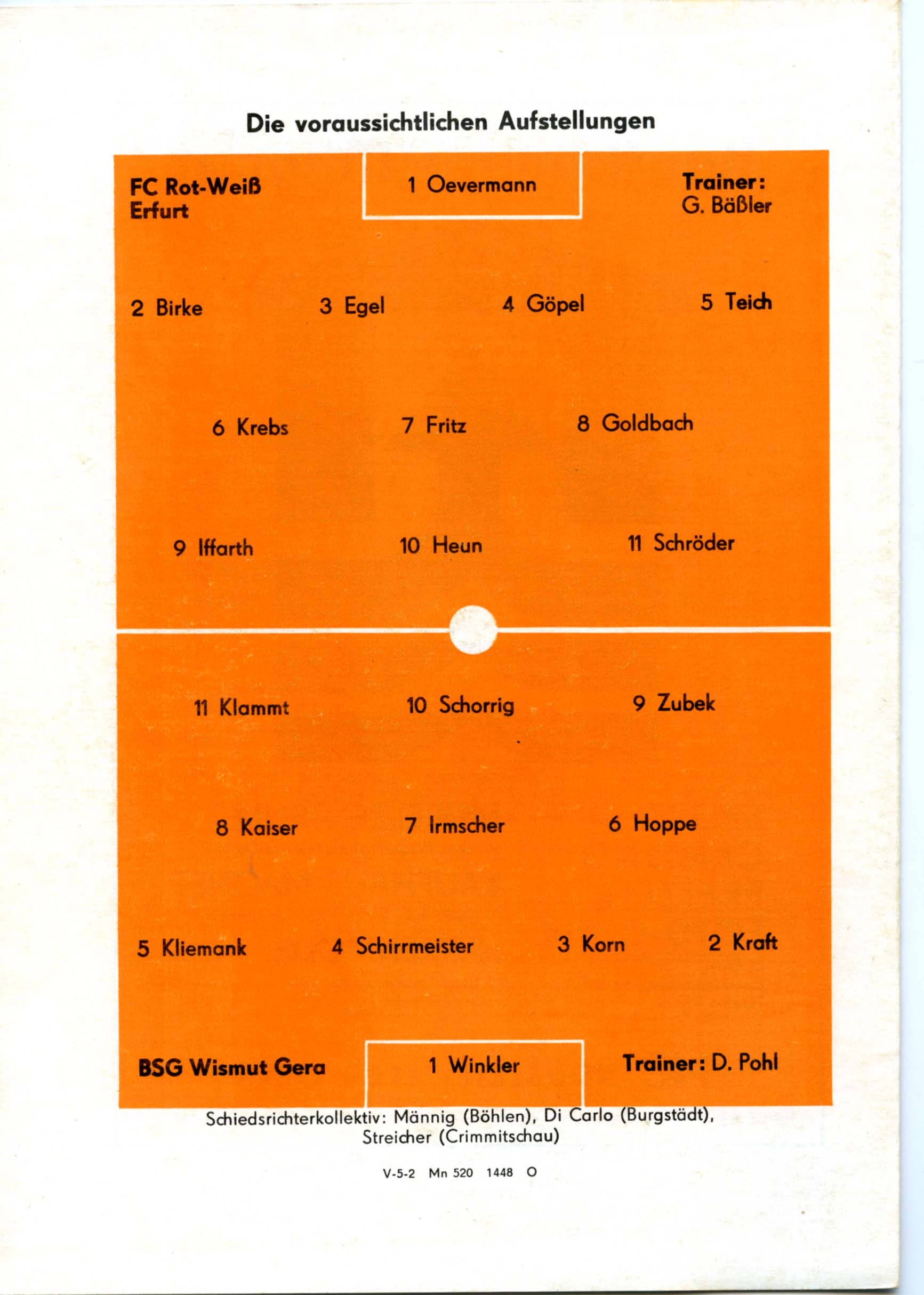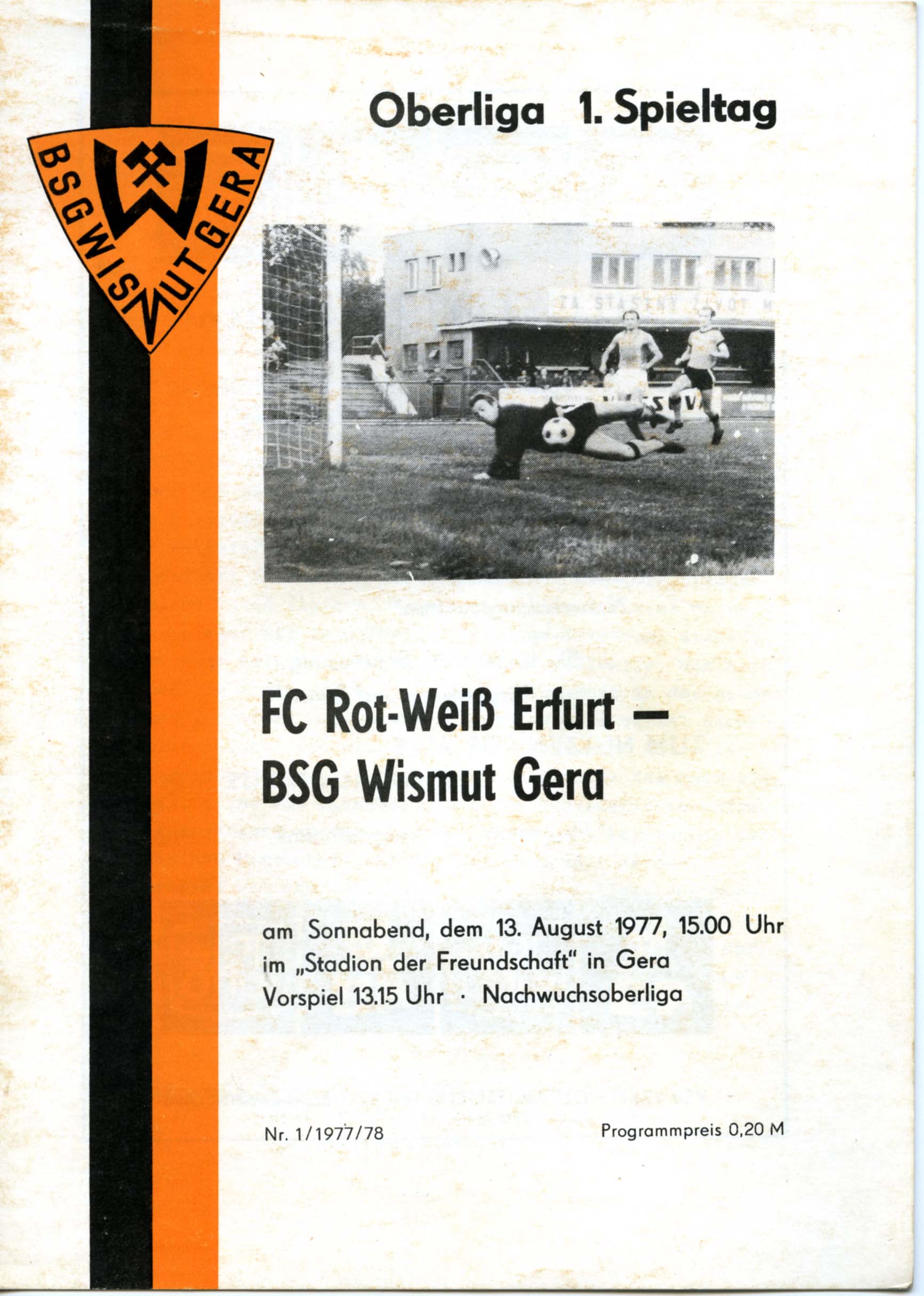 Fußball Oberliga, 1. Spieltag, Nr. 1, Spielzeit 1977/78, 13. August 1977, 15.00 Uhr, Stadion der Freundschaft in Gera, mit Tabellen und Texten sowie voraussichtliche Aufstellungen, 4 Seiten, 20,5 x 14,7 cm