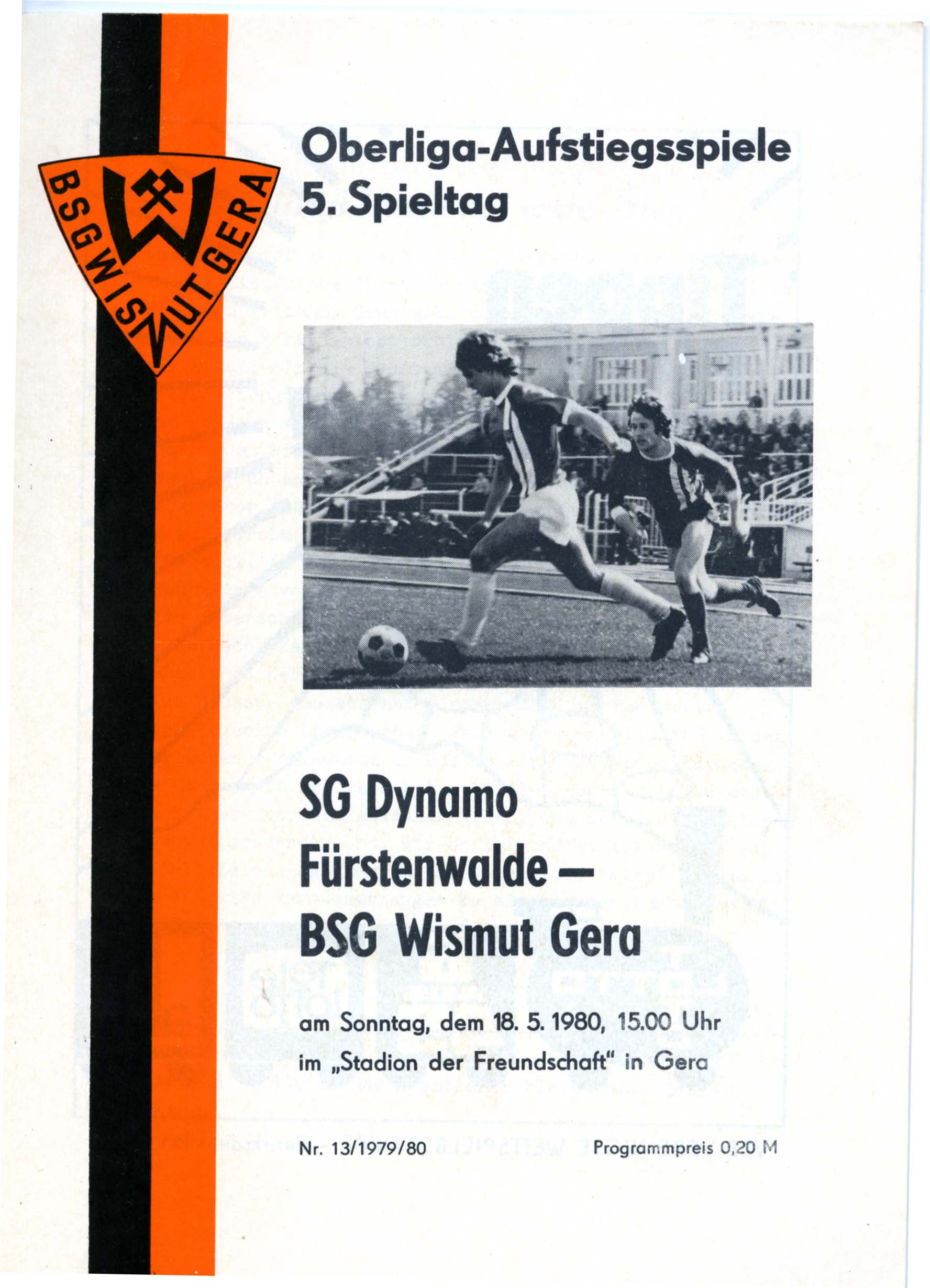 Fußball Oberliga-Aufstiegsspiel, 5. Spieltag, Nr. 13, Spielzeit 1979/80, 18. Mai 1980, 15.00 Uhr, Stadion der Freundschaft, mit Tabellen und Texten sowie voraussichtliche Aufstellungen, 4 Seiten, 20,5 x 14,7 cm