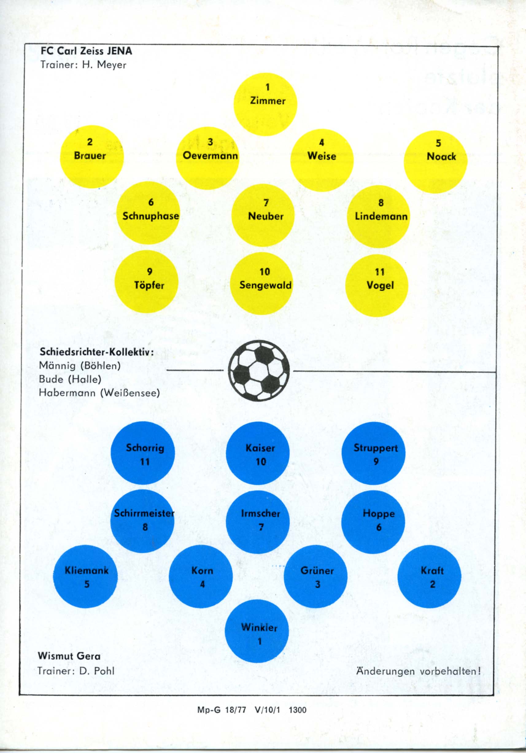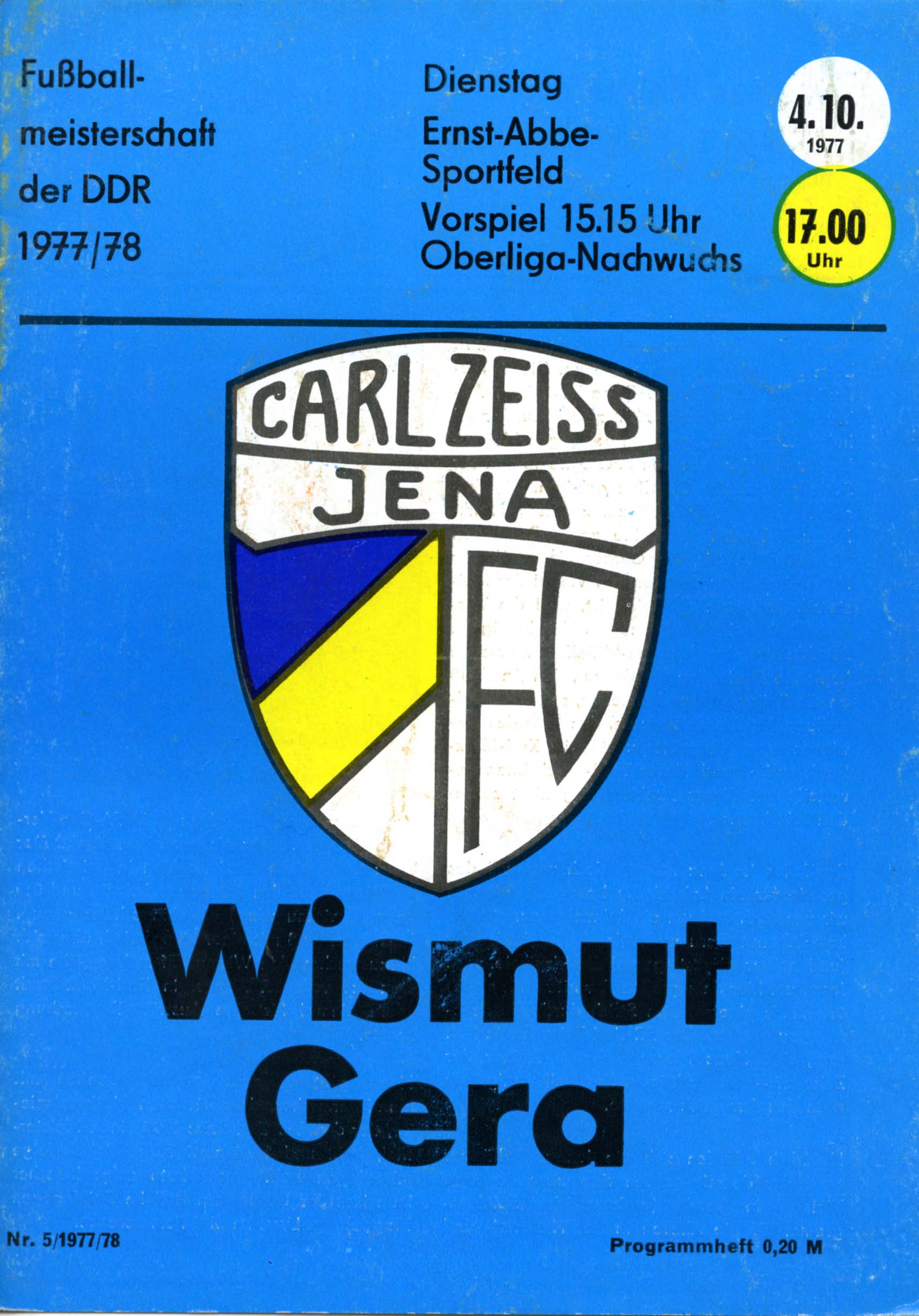 Fußball Oberliga, Nr. 5, Spielzeit 1977/78, 04. 10. 1977, 17.00 Uhr, im Ernst-Abbe-Sportfeld in Jena, mit Tabellen und Texten sowie voraussichtliche Aufstellungen, 6 Seiten, 20,5 x 14,9 cm