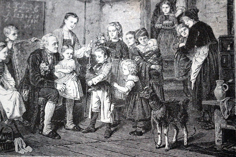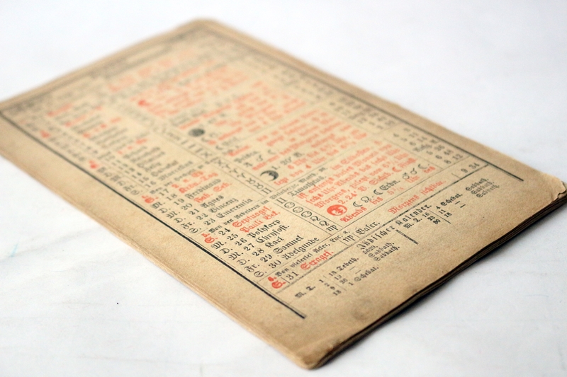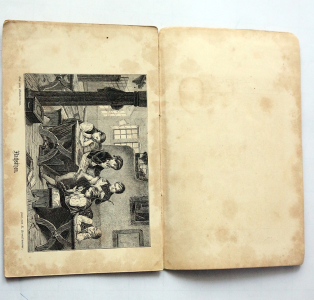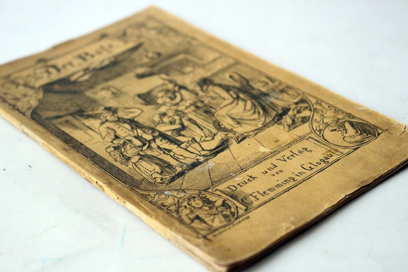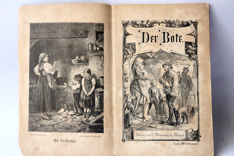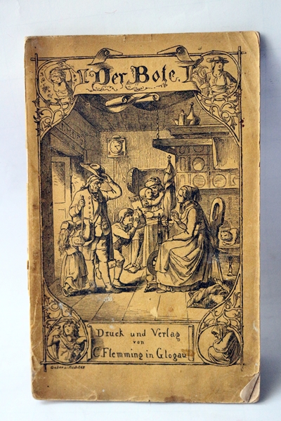 Verlag: C. Flemming in Glogau, 1869, Die Illustration auf dem Cover zeigt eine Familienszene in einer Stube. Der Verlag von Carl Flemming war im 19. Jahrhundert bekannt für Jugendschriften, kartographische Werke und landwirtschaftliche Literatur. Die Holzstiche im Buch stammen von X.A.v.A. Brend'amour, Volkskalender für alle Stände, 8 Holzstiche, 4 Seiten mit Monatsnamen für Notizen, Xaver Anton von Rieß Brendamour (1821-1897) war Holzstecher und Illustrator, er war bekannt für seine Holzschnitte, die in verschiedenen Zeitschriften und Büchern des 19. Jahrhunderts erschienen sind.