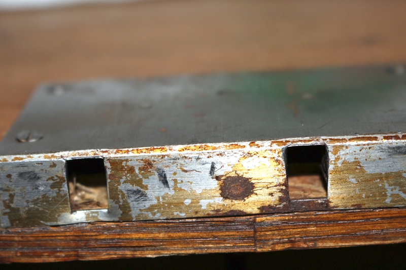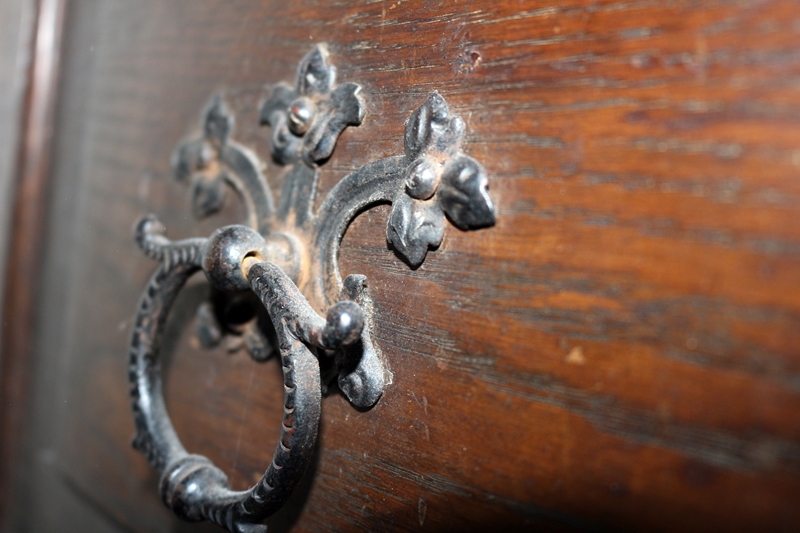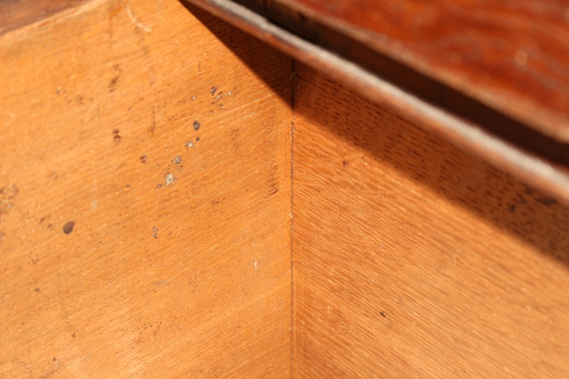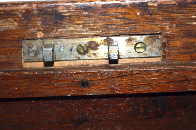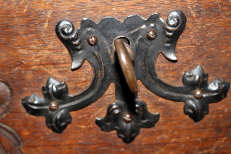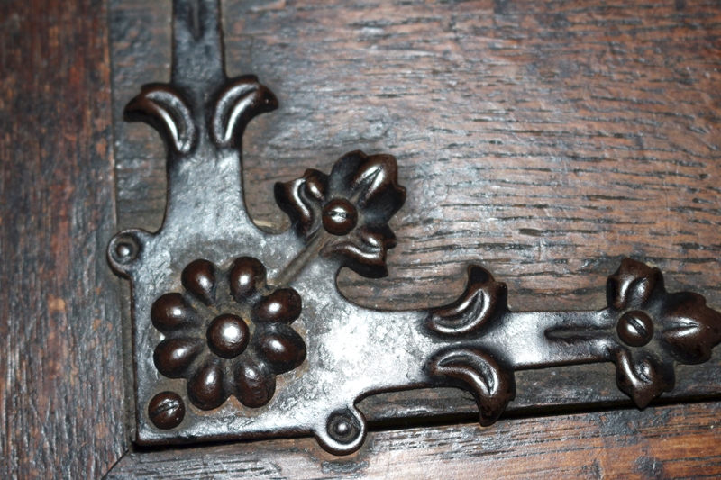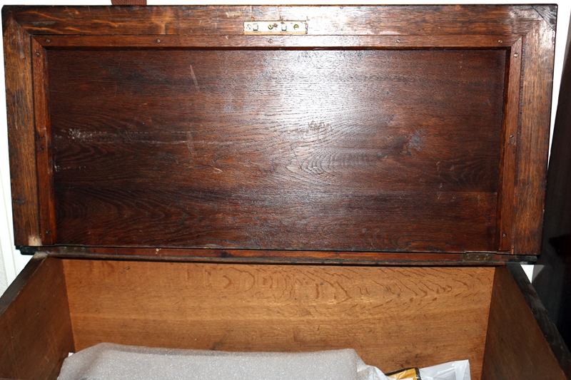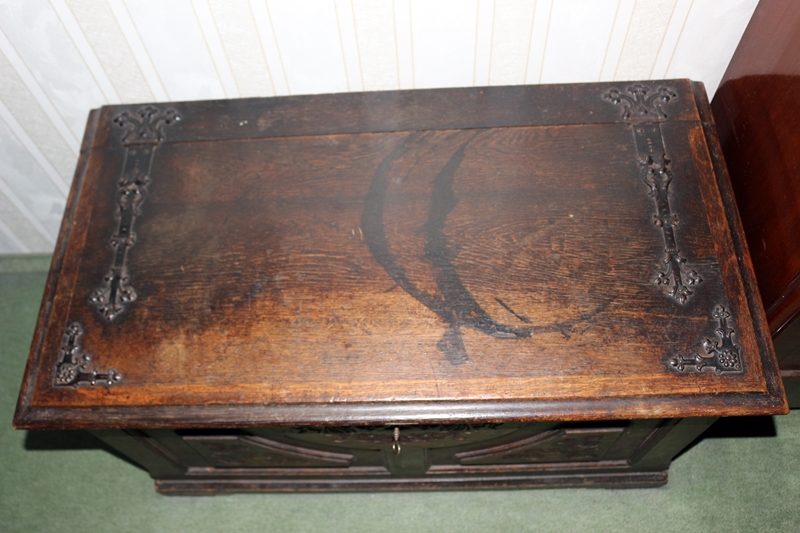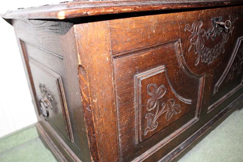 Truhe stammt aus dem frühen 19. Jahrhundert und könnte dem Barock- oder Renaissance-Stil zugeordnet werden, massives Eichenholz und originale Eisenbeschläge an den Ecken, Deckel und Front, aufklappbarer Deckel, Originalschloss mit Schlüssel, Front mit floralen Reliefs und profilierten Kassettenfeldern, Maße Höhe 50,0; Breite 89,5; Tiefe 48,5 cm