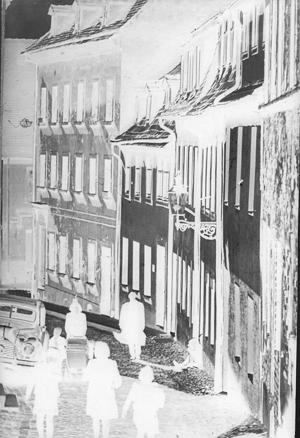 Original - Negativ, s/w, 6x9, Gasse in Gera mit Fußgängern, links geparktes Auto