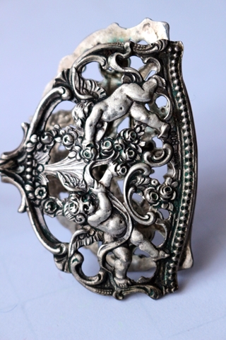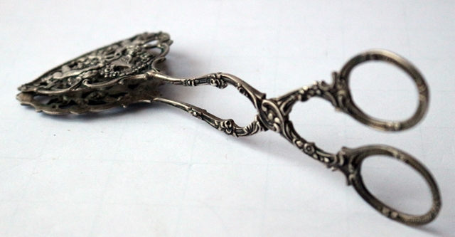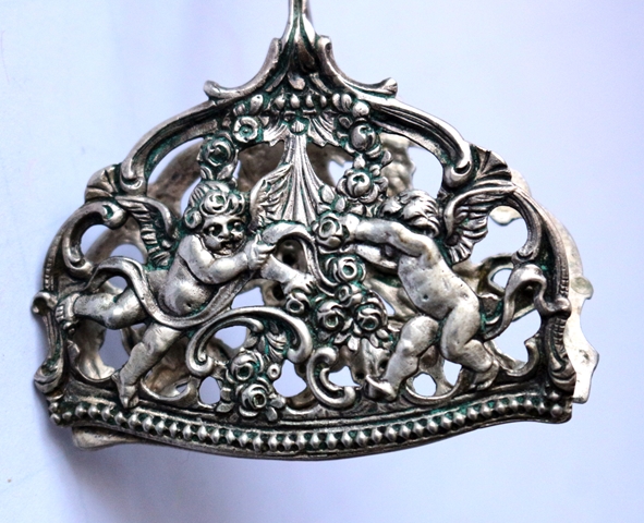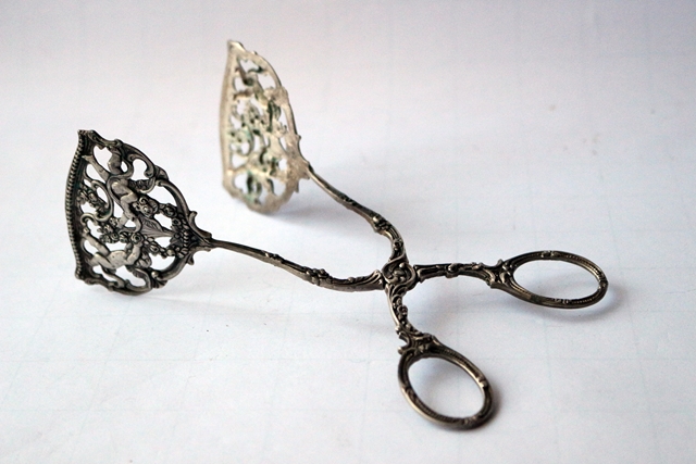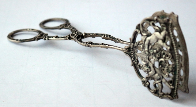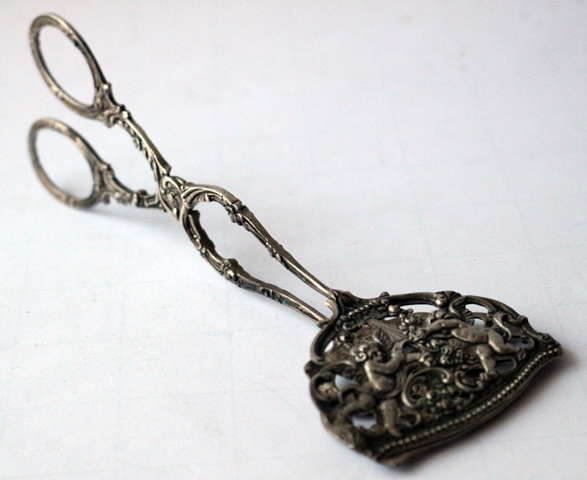 Gebäck- Kuchenzange, 800er Silber, punziert, mit Meistermarke in den Greifschalen, aufwendige Verzierungen, filigranes Design und Ornamente, Engelchen-Motive, Länge 16,5 cm; Breite 6,0 cm, Gewicht 50 g