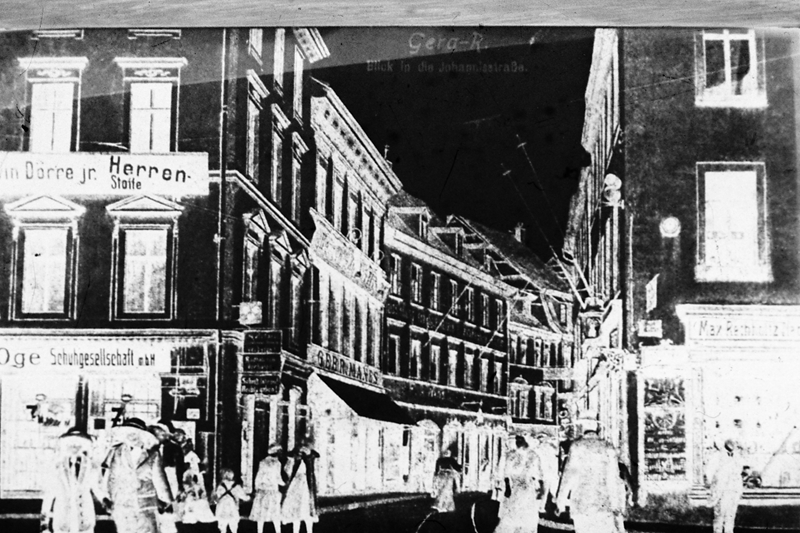 Original - Negativ, s/w, Kleinbild, Reproduktion, Blick in die Johannisstraße mit Geschäften und Fußgängern, um 1900