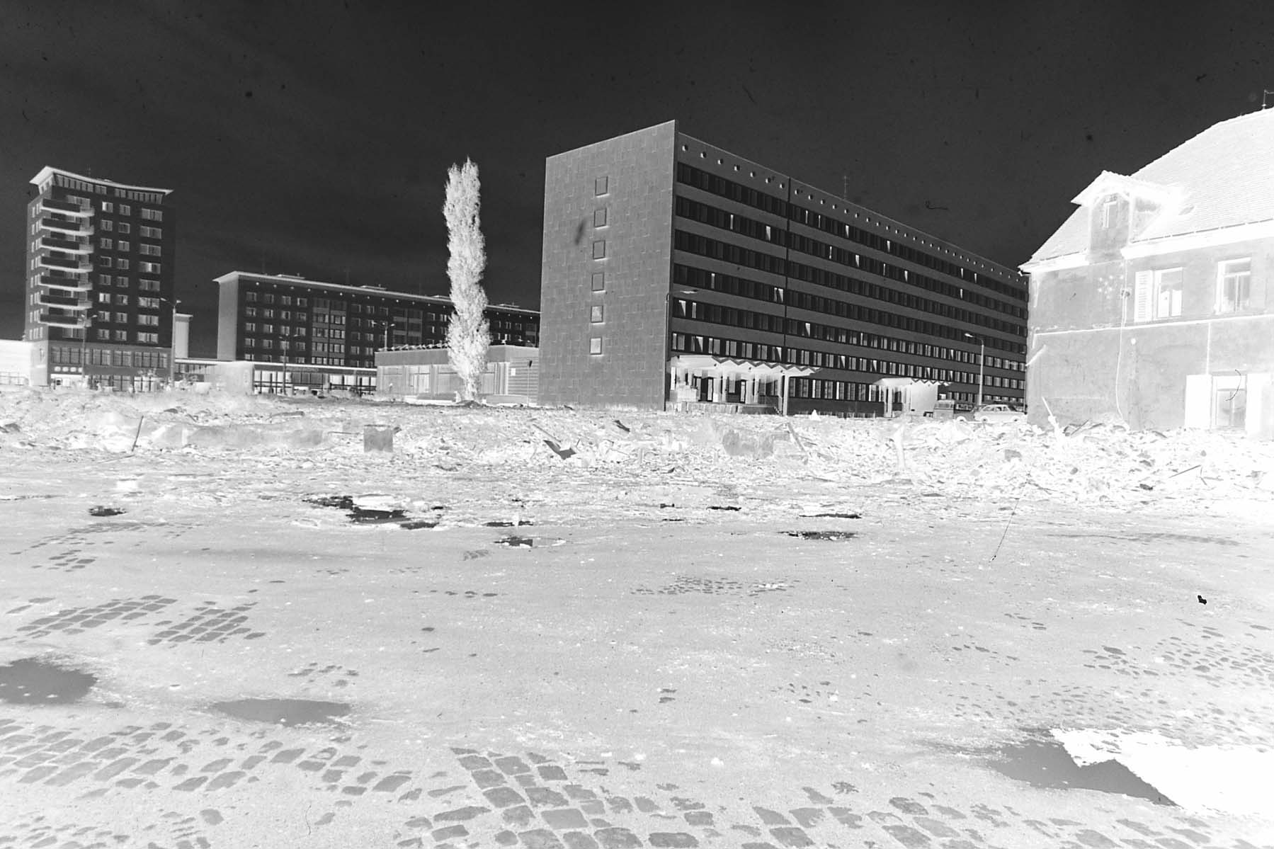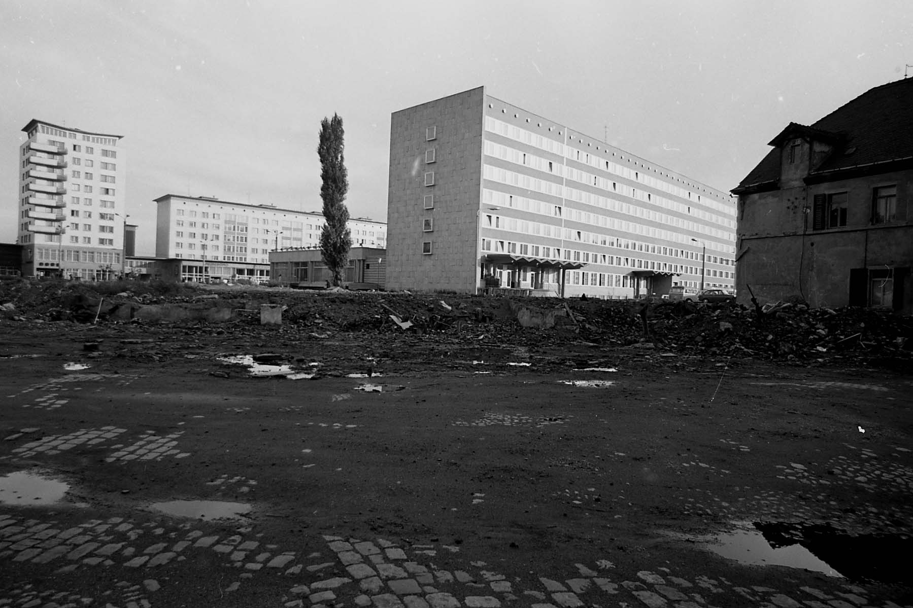 Original - Negativ, s/w, Kleinbild, Interhotel in Gera, kurz nach seiner Eröffnung 1967, mit Gastronom und Ladenstraße, Vordergrund große Baugrube mit alten Pflastern, rechts Altbau