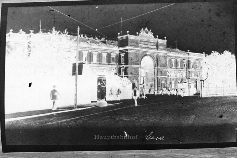 Original - Negativ, s/w, Kleinbild, Reproduktion, Hauptbahnhof mit Straßenbahn und Fußgängern, um 1900