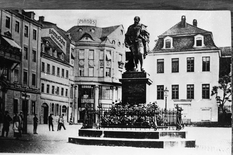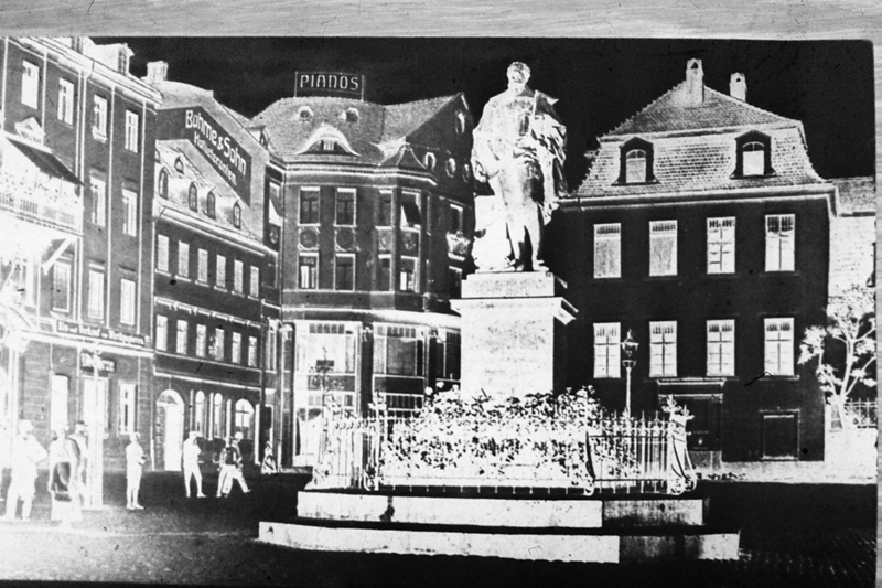 Original - Negativ, s/w, Kleinbild, Reproduktion, Heinrich-Posthumus-Denkmal, 1902 errichtet und erinnerte an Heinrich Posthumus Reuß (15721635). Im Hintergrund das Geschäftshaus des Klavierhauses Böhme & Sohn, um 1910