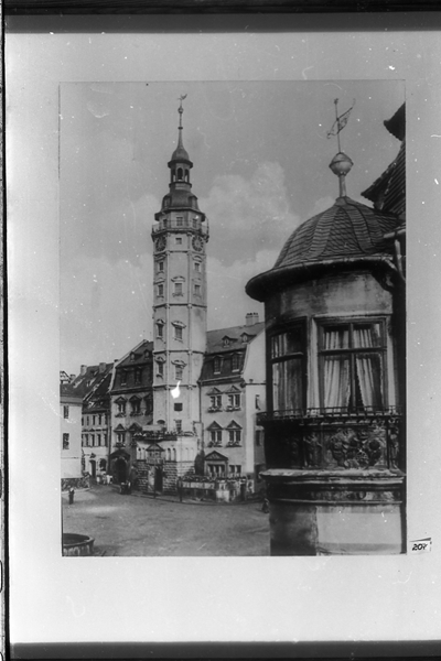 Original - Negativ, s/w, Kleinbild, Reproduktion, Das Rathaus ist ein dreigeschossiger Renaissancebau. Der dazugehörige Turm ist über 57 Meter hoch und hat schiefe Fenster