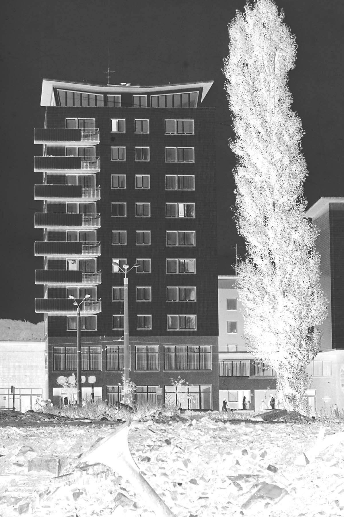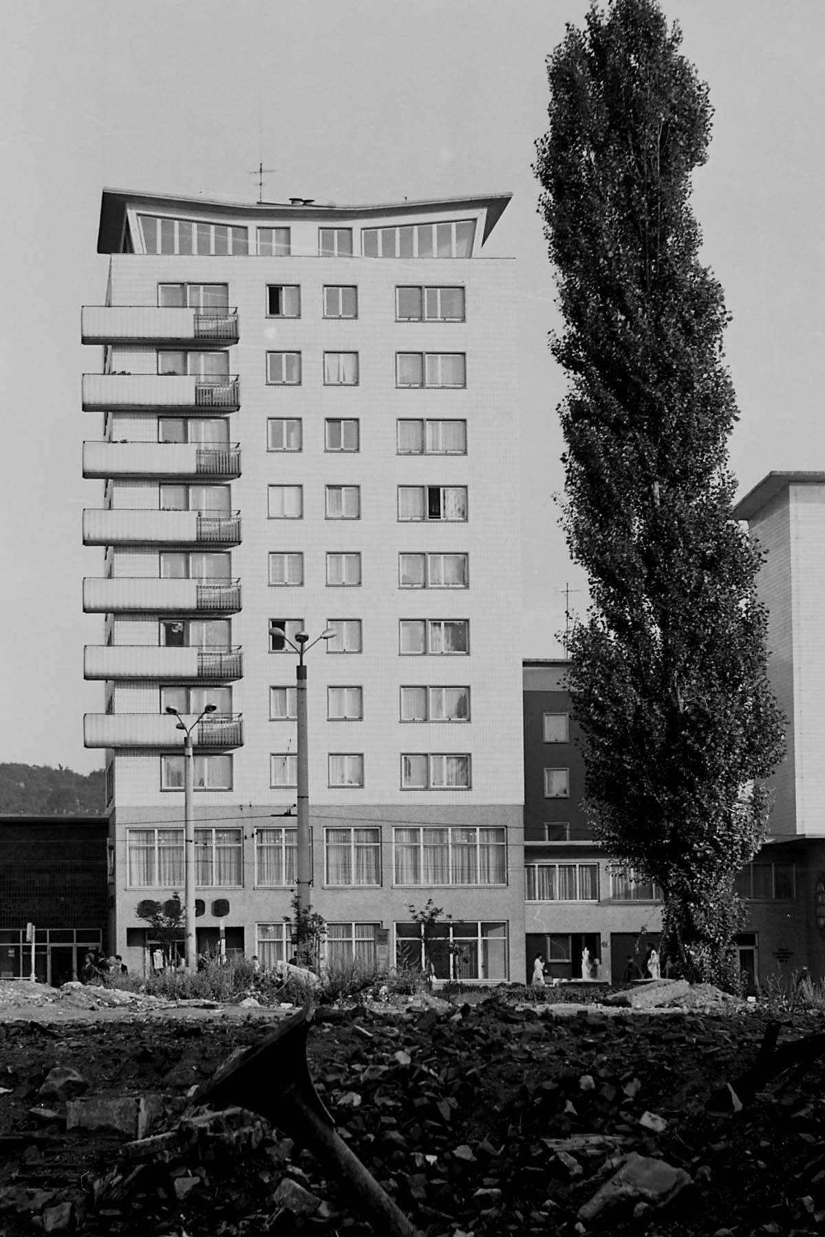 Original - Negativ, s/w, Kleinbild, SB Gastronom in Gera, kurz nach seiner Eröffnung im Juni 1964, rechts hoher Baum, Vordergrund Bauschutt