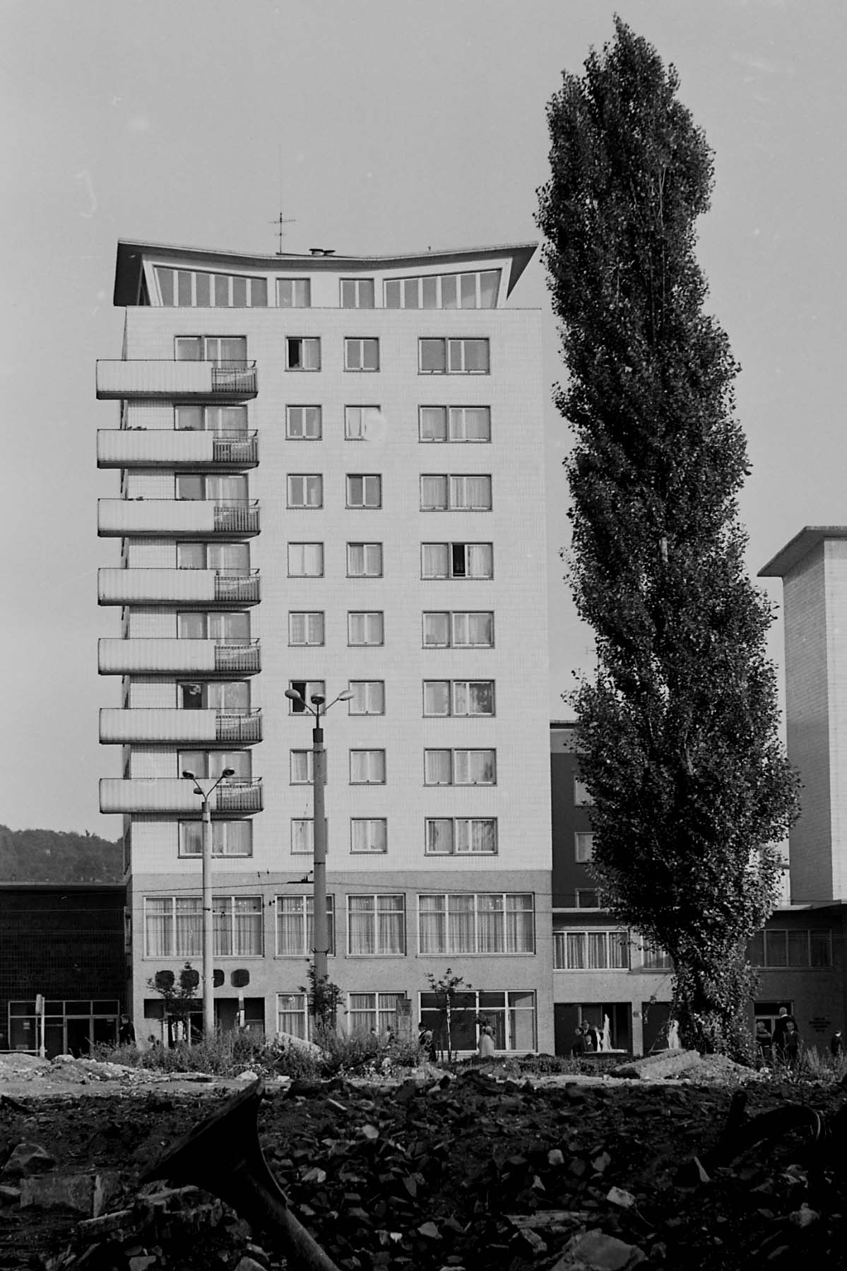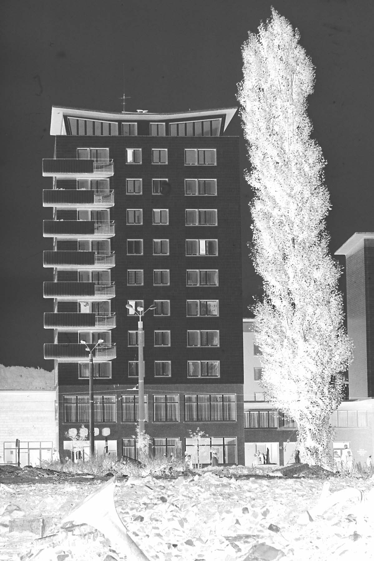 Original - Negativ, s/w, Kleinbild, SB Gastronom in Gera, kurz nach seiner Eröffnung im Juni 1964, rechts hoher Baum, Vordergrund Baugrube wohl für den Springbrunnen