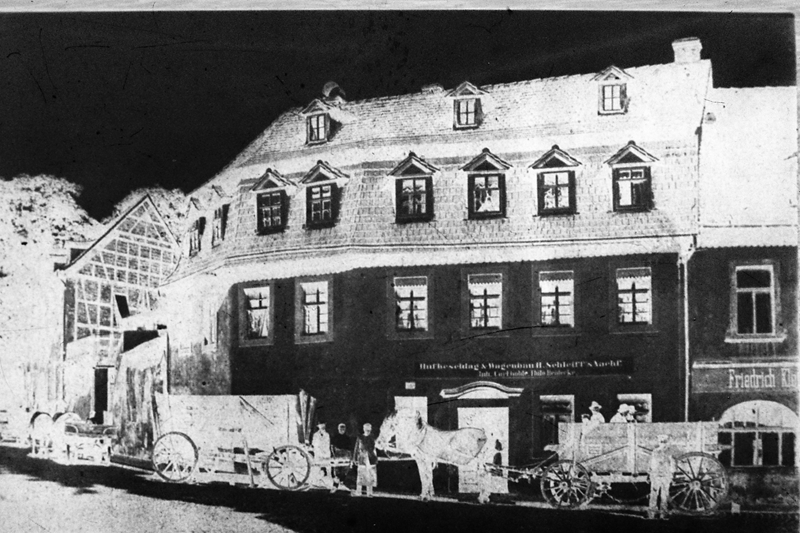 Original - Negativ, s/w, Kleinbild, Reproduktion, Geschäft Hufbeschlag und Wagenbau H. Schleiff & Nachf., davor Pferdegespanne, um 1900