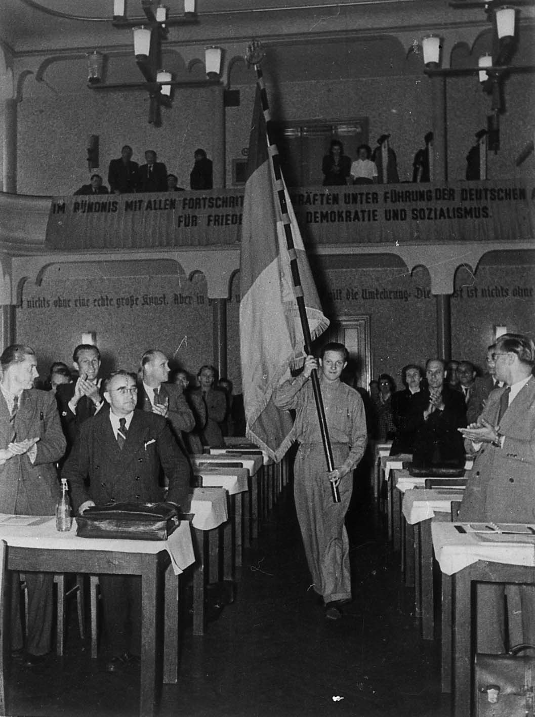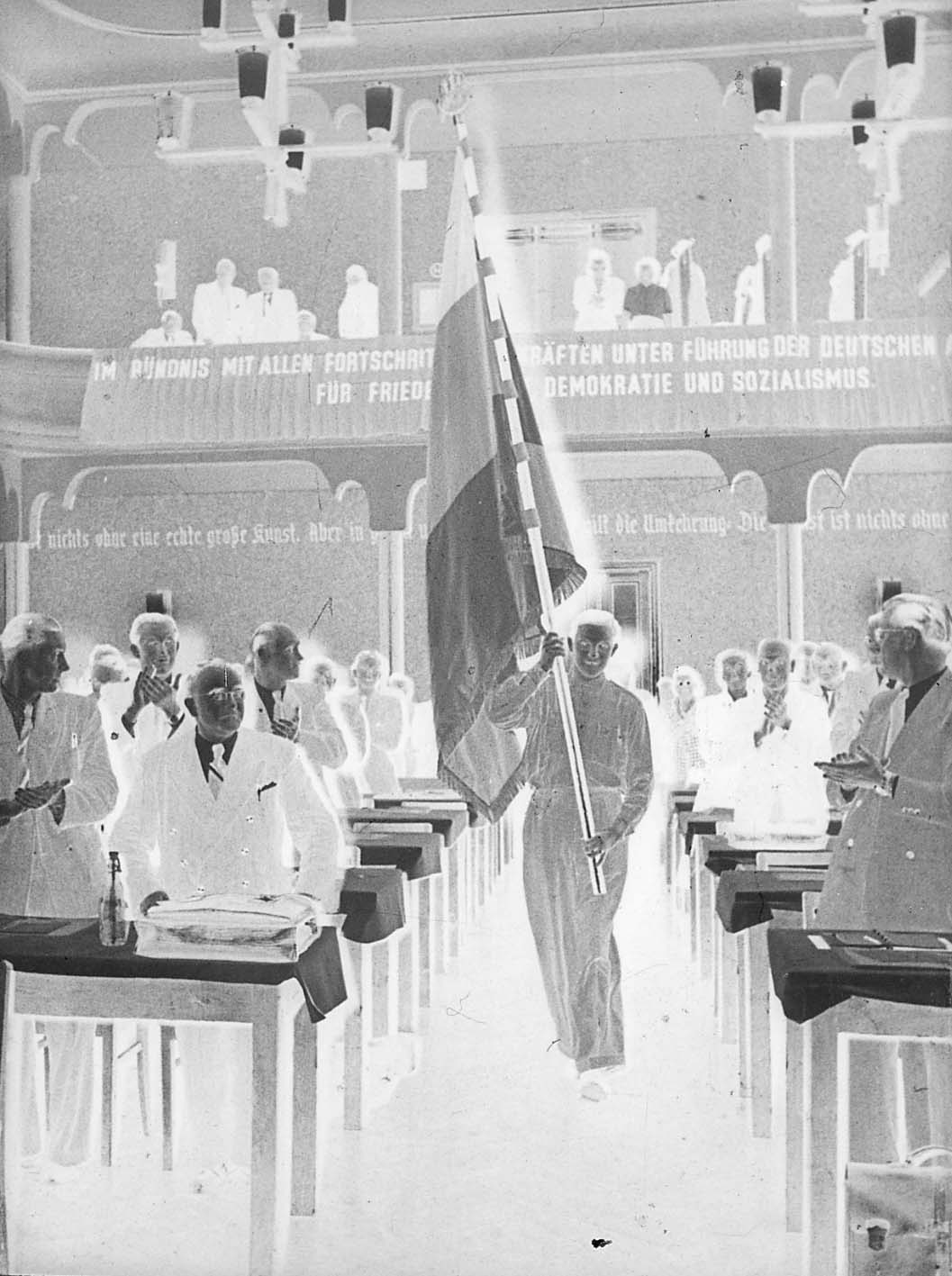Original - Negativ, s/w, 6x9, Versammlung der Sozialistischen Einheitspartei Deutschlands (SED) in der frühen Nachkriegszeit, vermutlich im Zusammenhang mit der Gründung der Deutschen Demokratischen Republik (DDR), Banner im Hintergrund trägt die Aufschrift: "IM BÜNDNIS MIT ALLEN FORTSCHRITTSKRÄFTEN UNTER FÜHRUNG DER DEUTSCHEN DEMOKRATIE UND SOZIALISMUS."