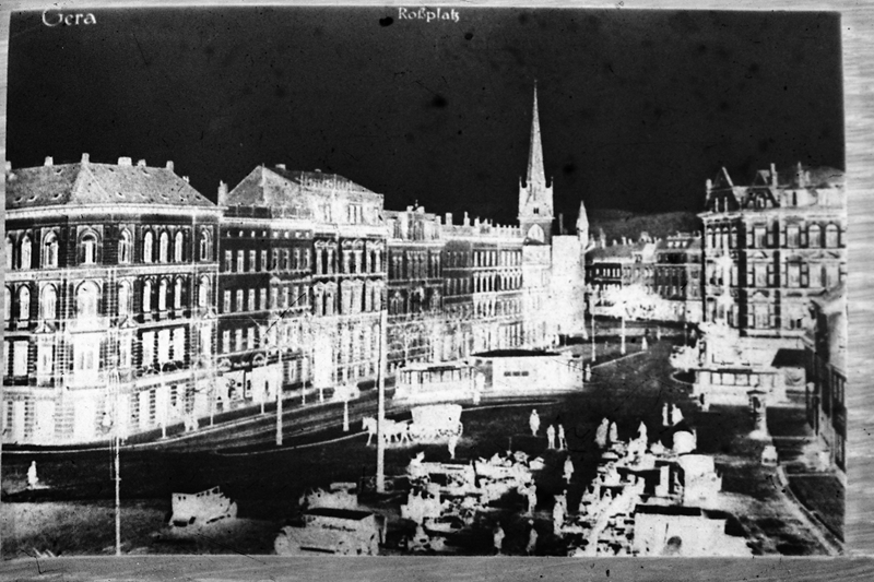 Original - Negativ, s/w, Kleinbild, Reproduktion, Roßplatz in Gera, Mit Straßenbahnen, Autos und Fußgängern, um 1910