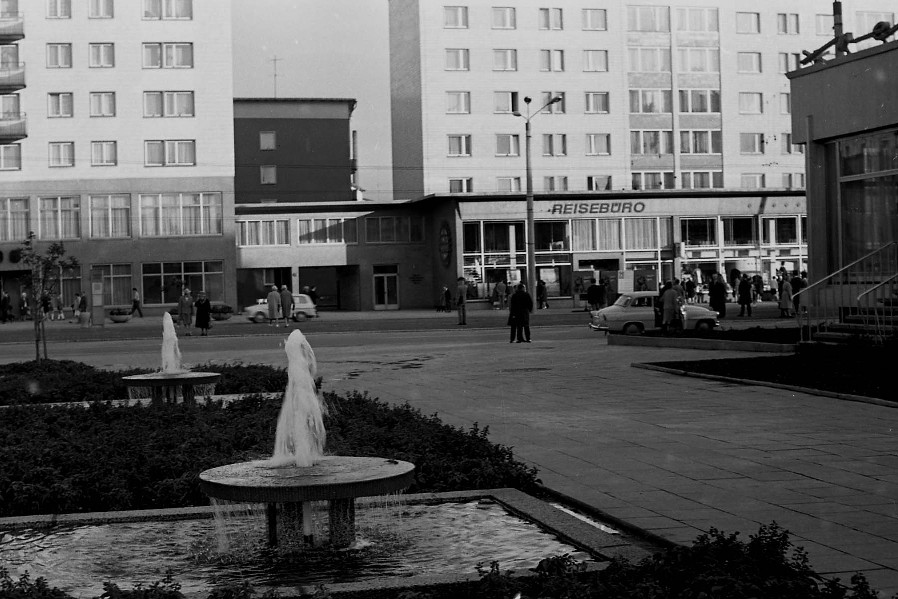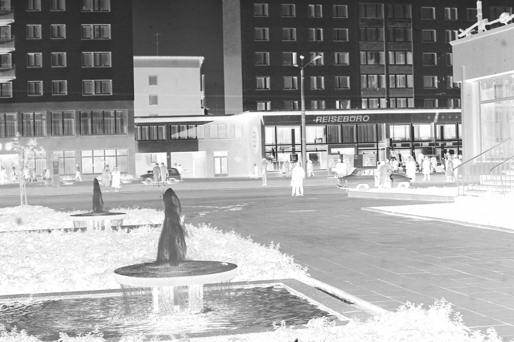 Original - Negativ, s/w, Kleinbild, Reisebüro und Springbrunnen im Vordergrund