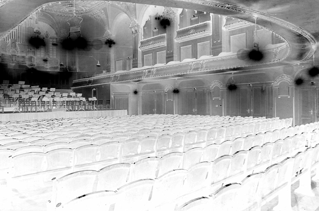 Original - Negativ, s/w, 9x12, Konzertsaal des Theaters mit Parkett, 1. Rang rechts, Bühne und Orgel, Beleuchtung eingeschaltet