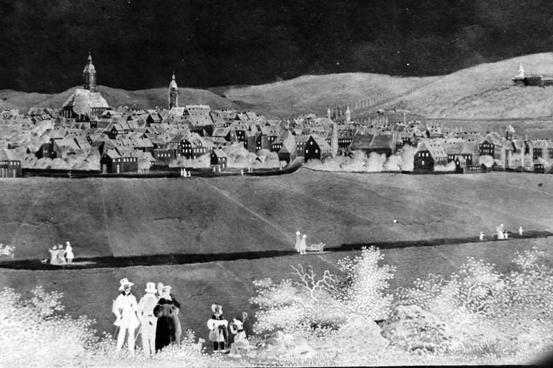 Original - Negativ, s/w, Kleinbild, Reproduktion, Gesamtansicht von Gera, Vordergrund Personen, um 1700