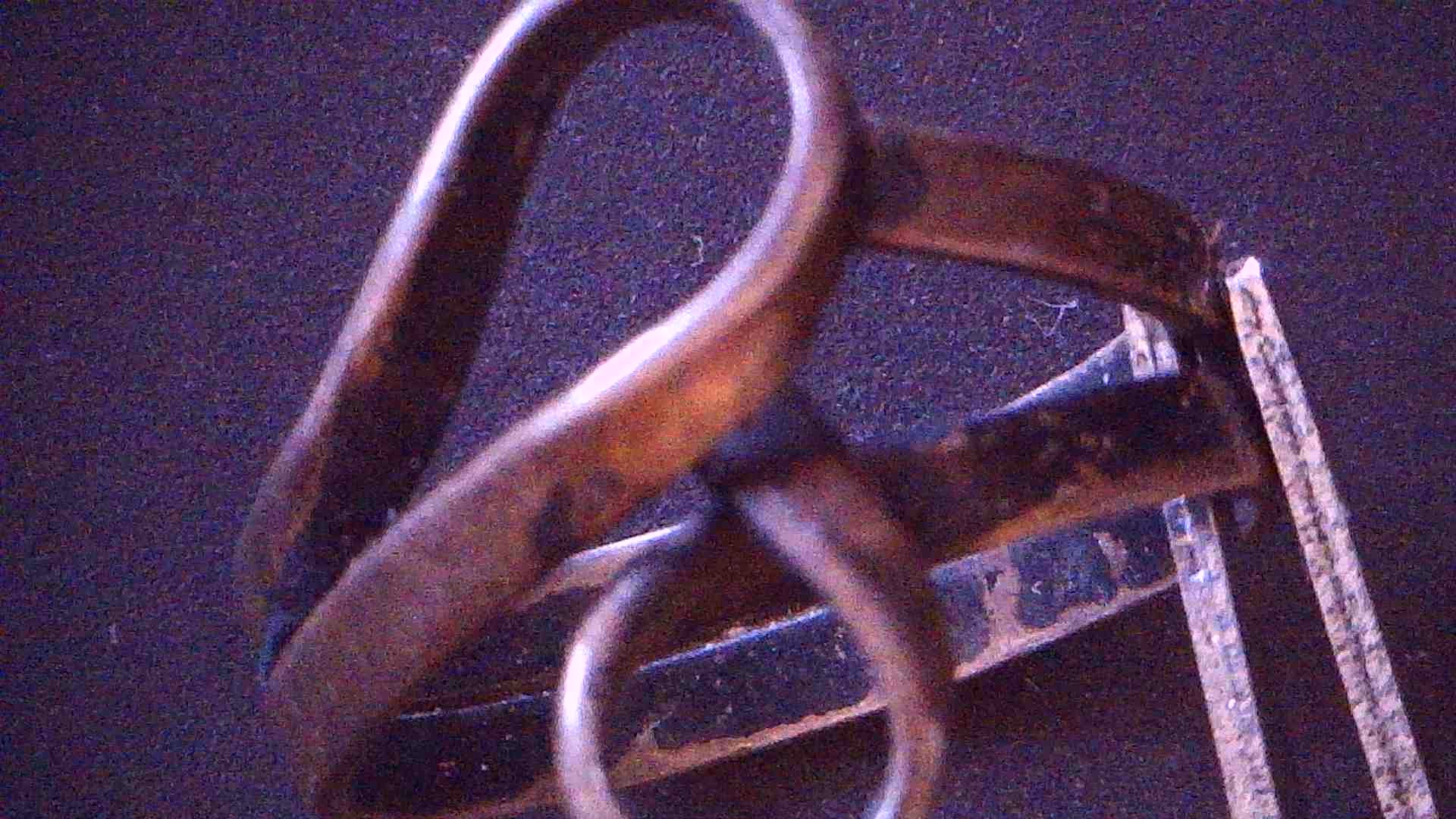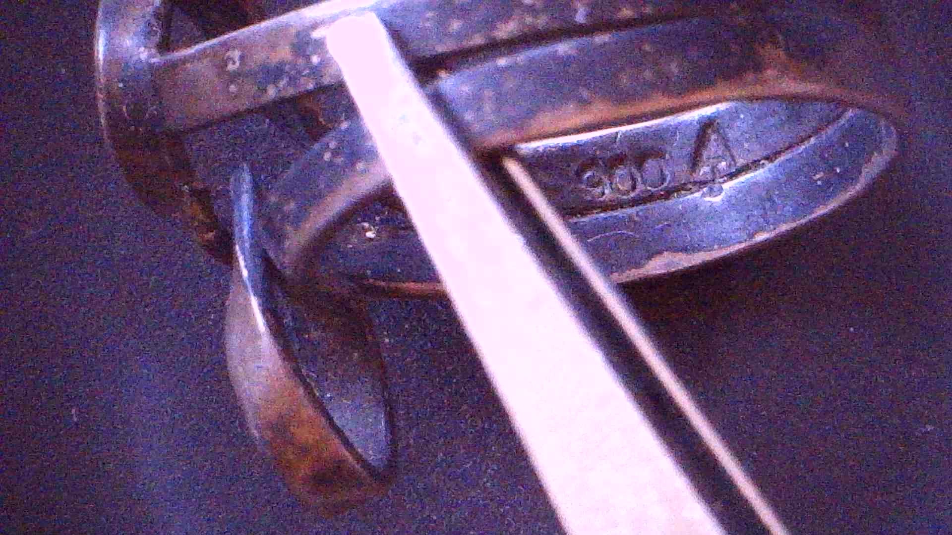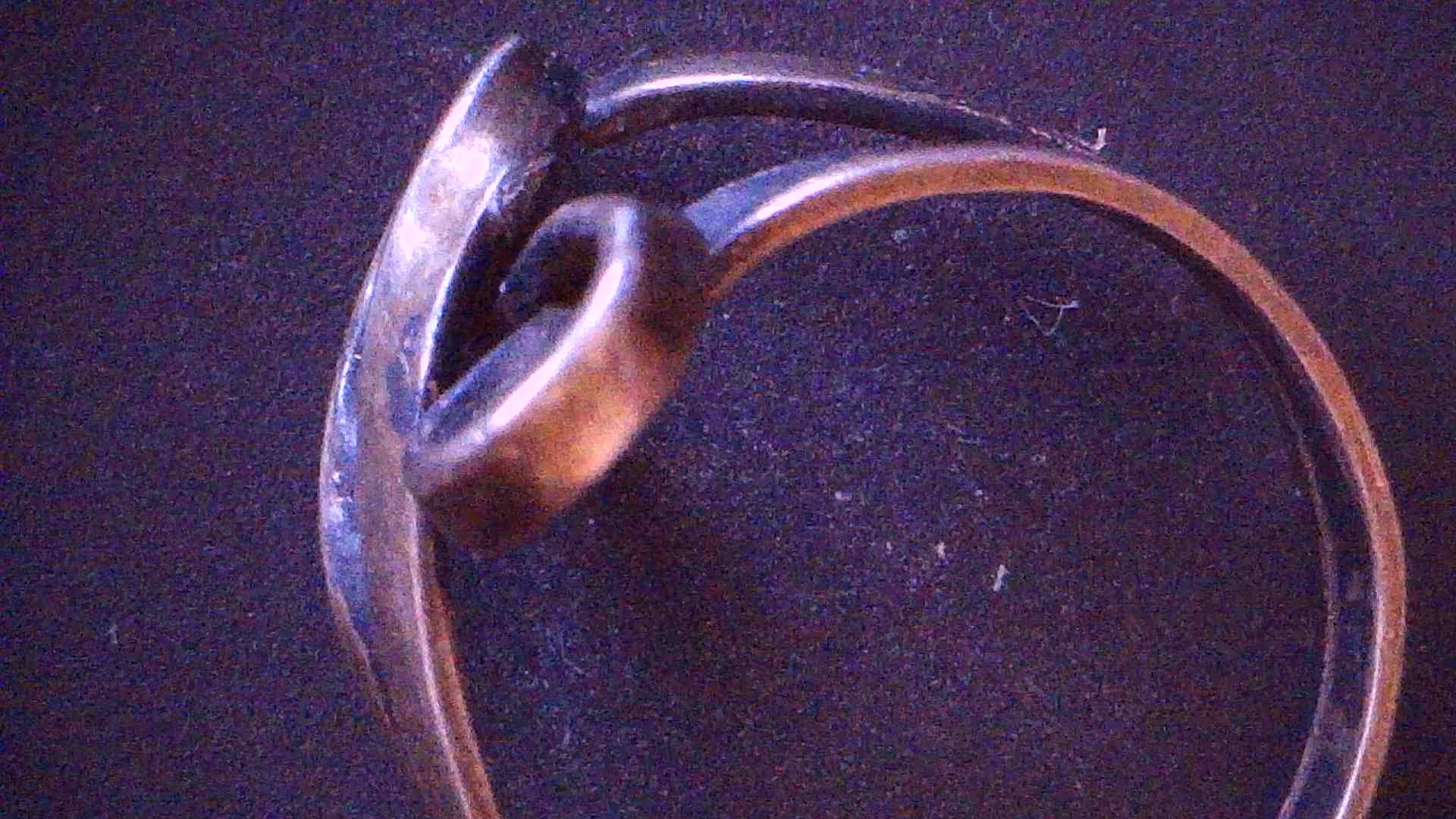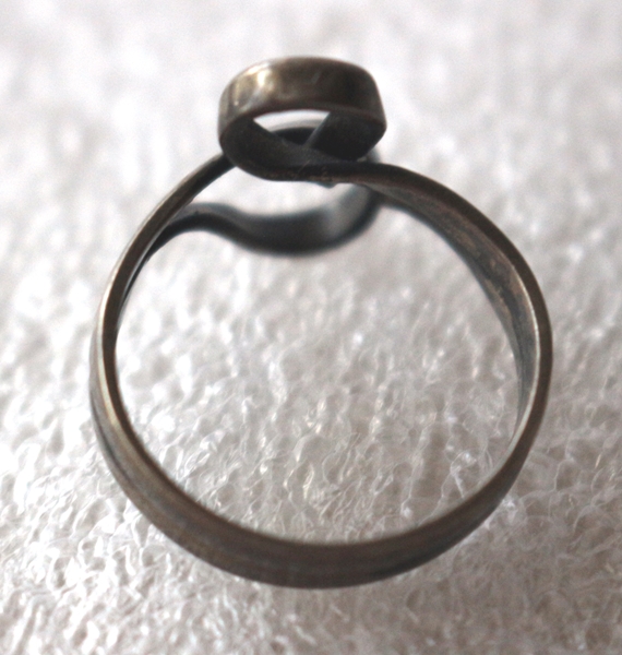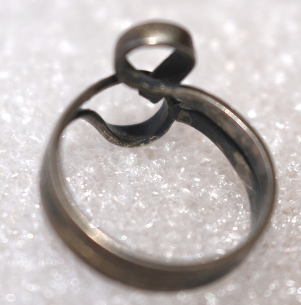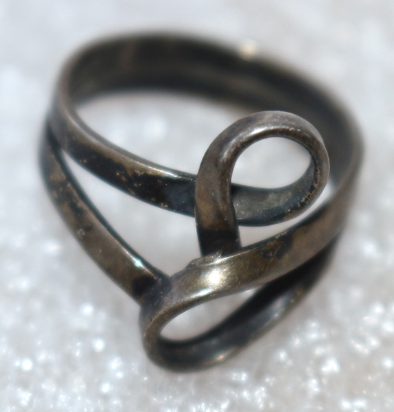 Geschwungener Silberring, Jugendstil, Silber punziert 900, mit Meistermarke (nicht erkennbar) Höhe 2,0; Inn-Dm 1,7 cm; Breite oben 1,7 cm, 3,0 g