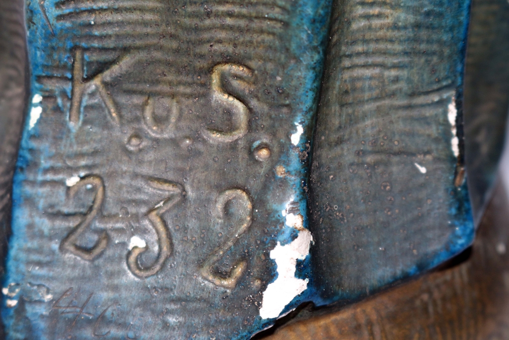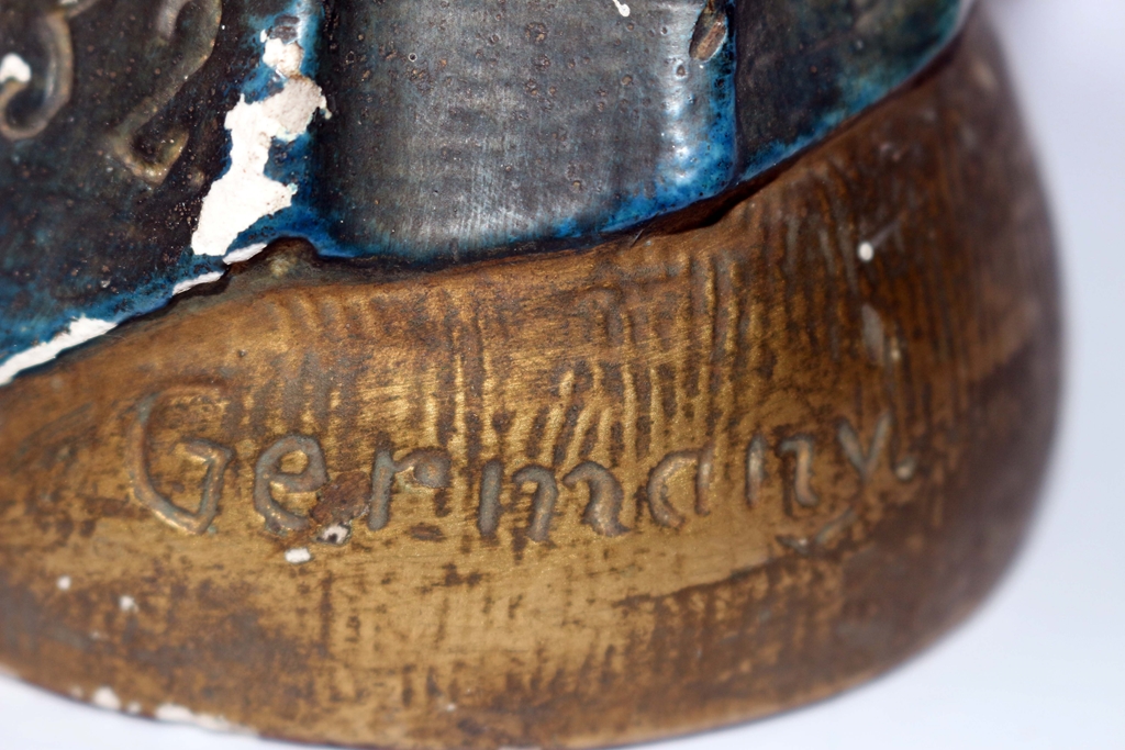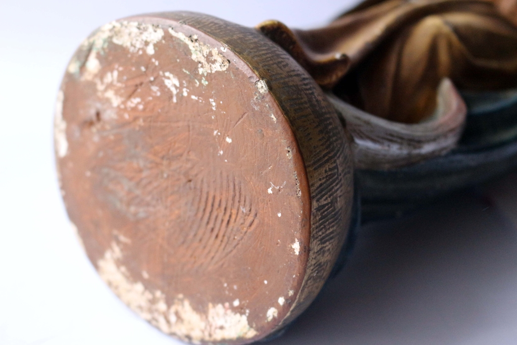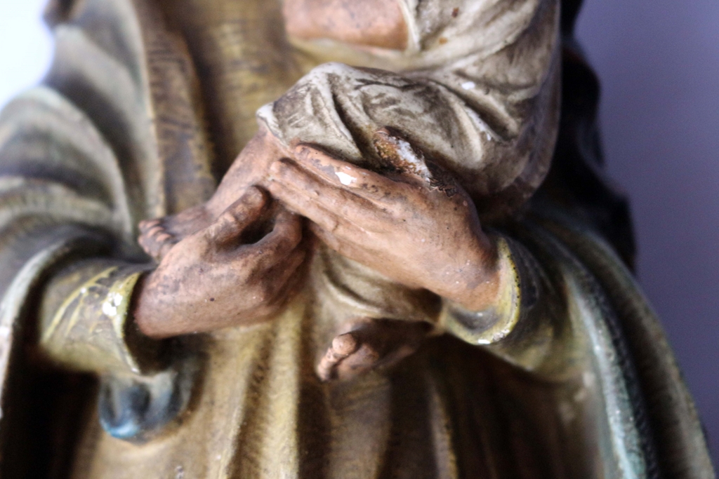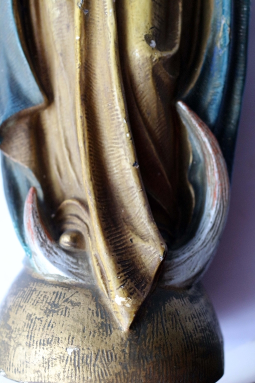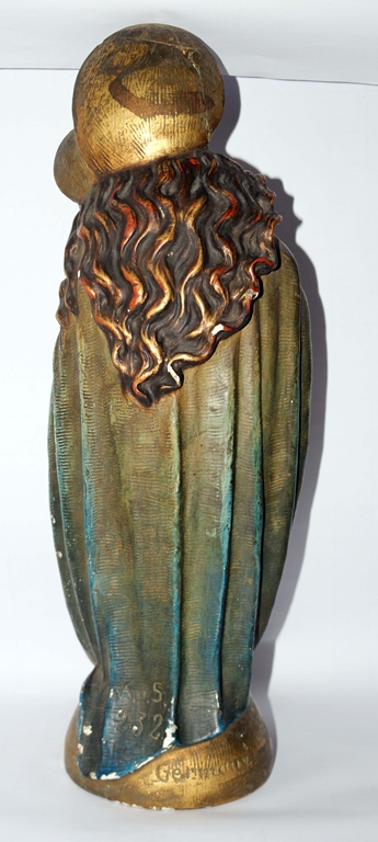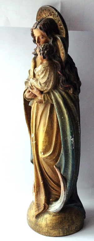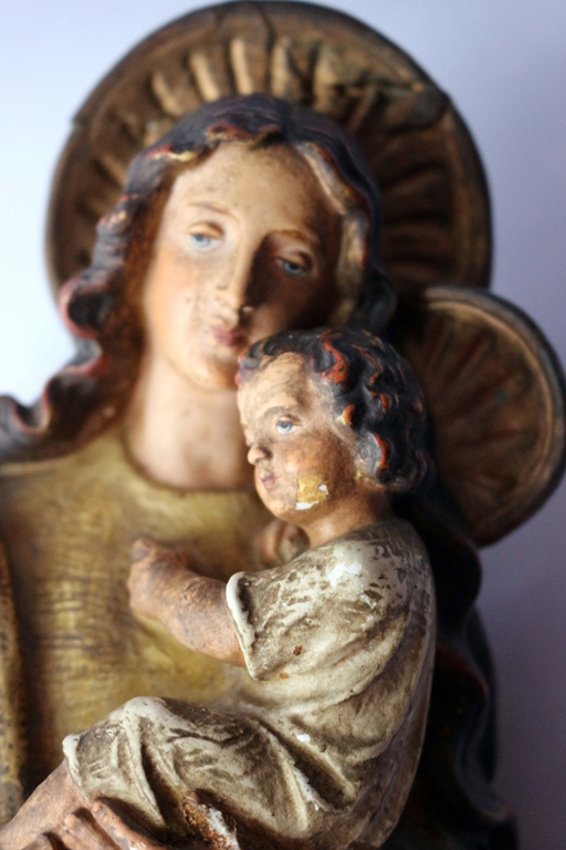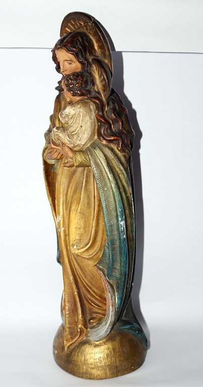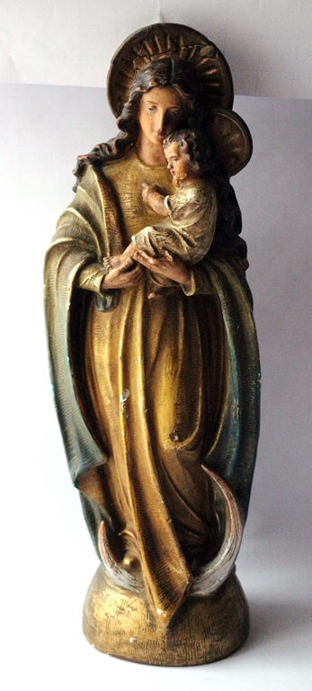Die Jungfrau Maria trägt das Jesuskind auf ihrem linken Arm. Beide Figuren sind polychrom (mehrfarbig) gefasst und weisen Vergoldungen auf.. Die Darstellung ist vom Typ der Eleousa („Barmherzige“) oder Glykophilousa („Liebkosende“). Maria ist am Rücken mit einem Mantel bekleidet. Sie steht auf der Erde, aus der links und rechts die Spitzen der Mondsichel herausragen. Die Mondsichel zu ihren Füßen ist ein klassisches Attribut der "Immaculata" (Unbefleckten Empfängnis, Initialen am unteren Mantelende: K.u.S., 232, im Sockel Germany, Sockel 13,5 x 12,5 cm