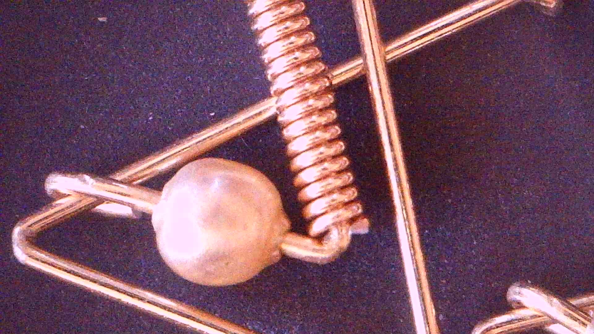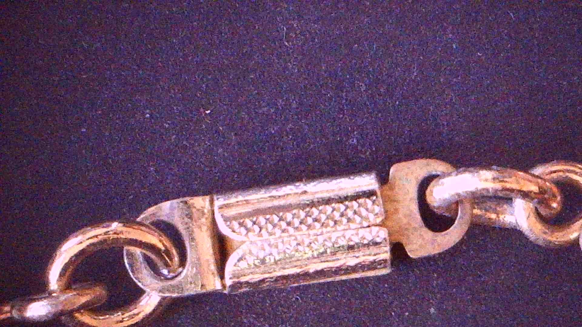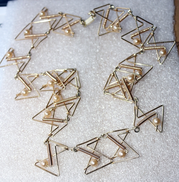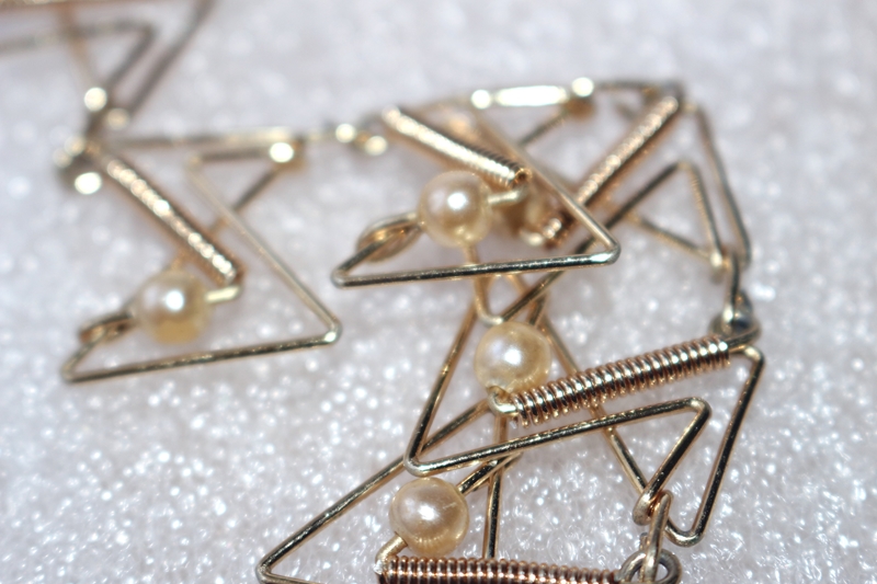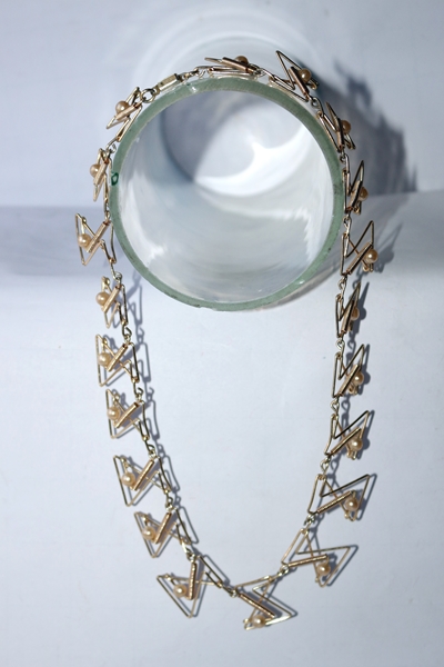 Dreiecks-Kette, goldfarbenes Metall mit Metallfeder-Verzierung und matten Glasperlen, Länge geschlossen 24,0 cm, Breite der Glieder 2,0, 13,0 g