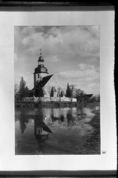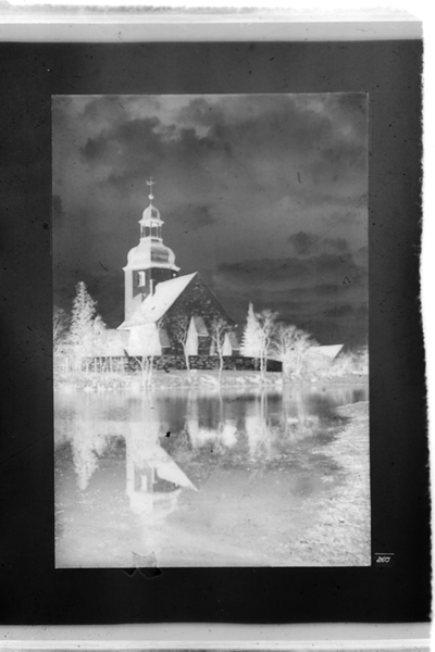 Original - Negativ, s/w, Kleinbild, Reproduktion, Kirchenrückseite mit Gewässer