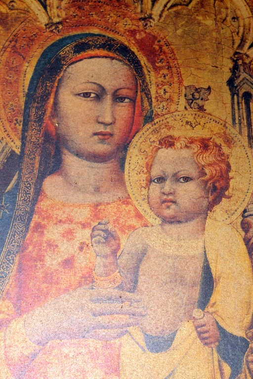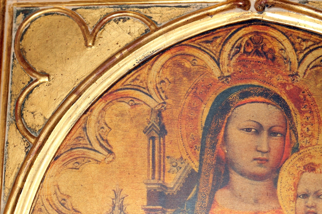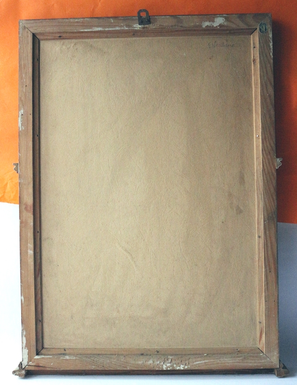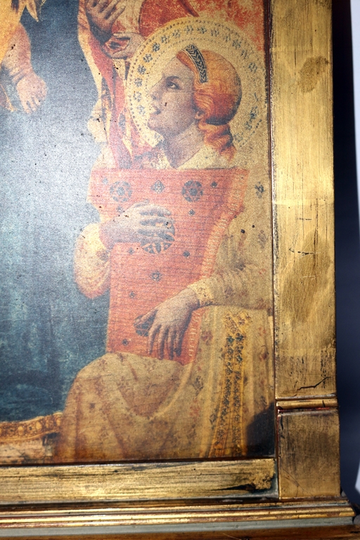 "Madonna mit Kind, thronend, mit zwei Engeln und einem Stifter", mit vergoldetem Rahmen in Form eines Kirchengewölbes, Rahmengröße 57,5 x 43,5 x 3,8 cm, sichtbares Bild Höhe in der Mitte 49,5 x 34,0 cm