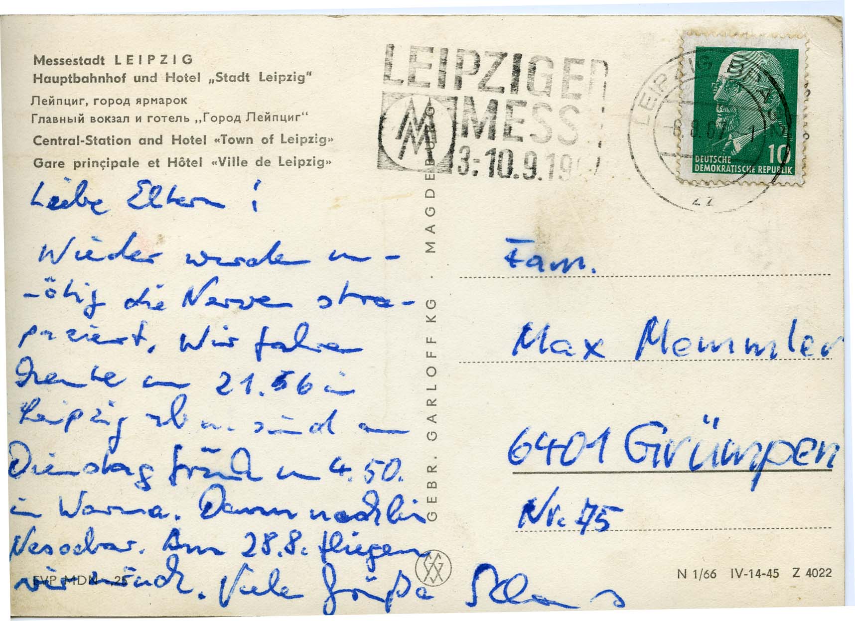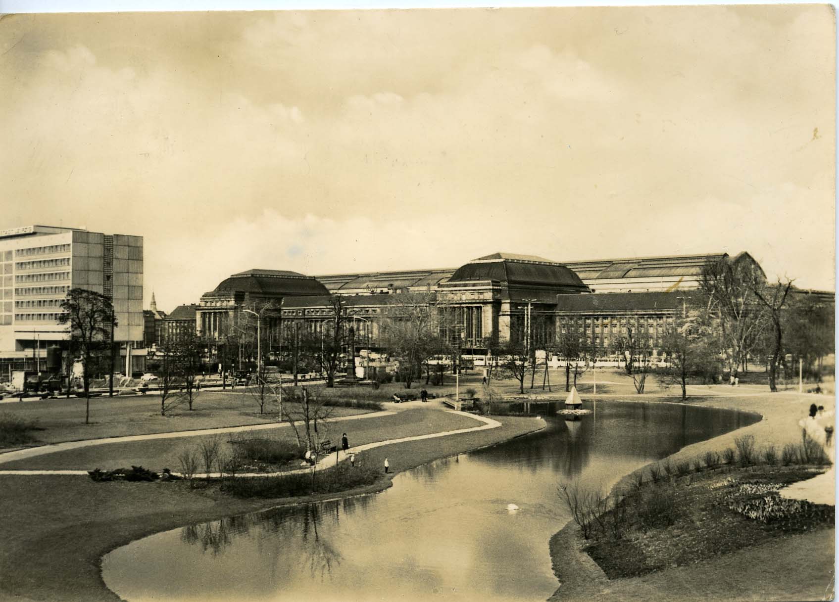 AK/Postkarte Leipzig mit Hauptbahnhof und Hotel "Stadt Leipzig", Gebr. Garloff KG, Magdeburg, beschrieben, gelaufen, mit Briefmarke und Stempel, Maße 10,3 x 14,5 cm