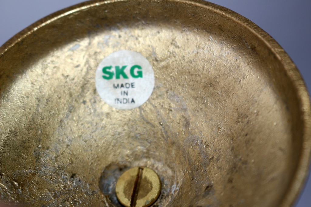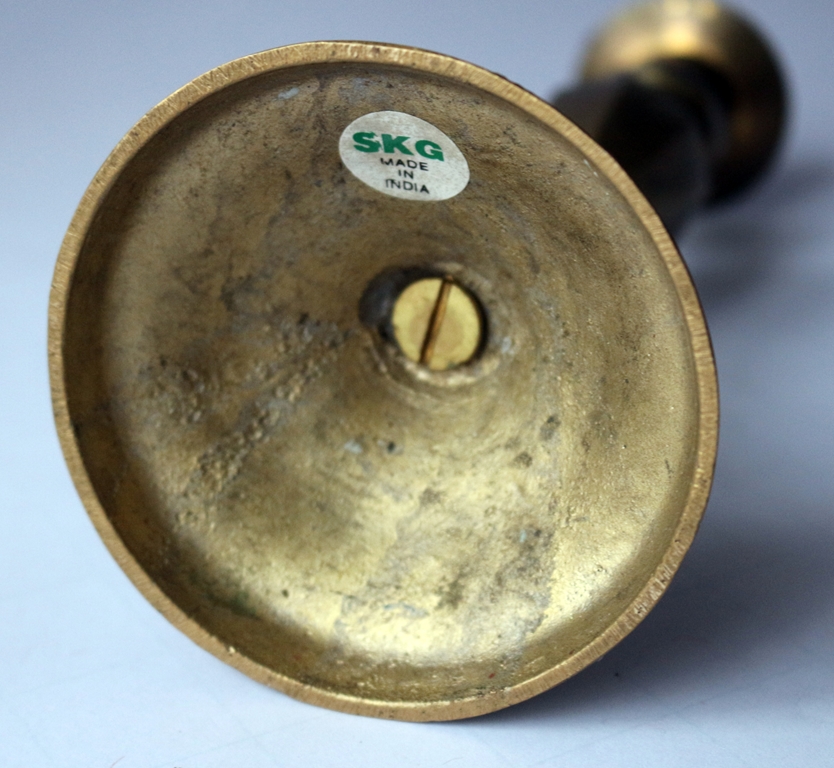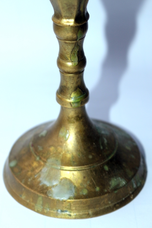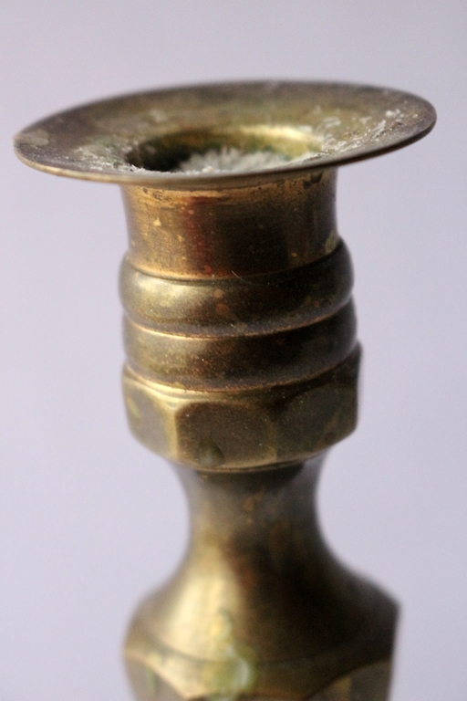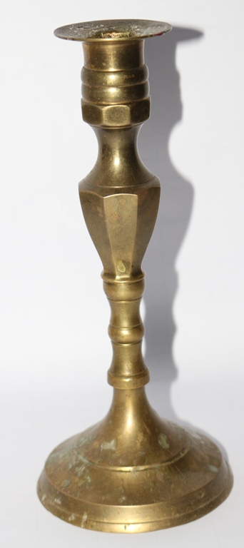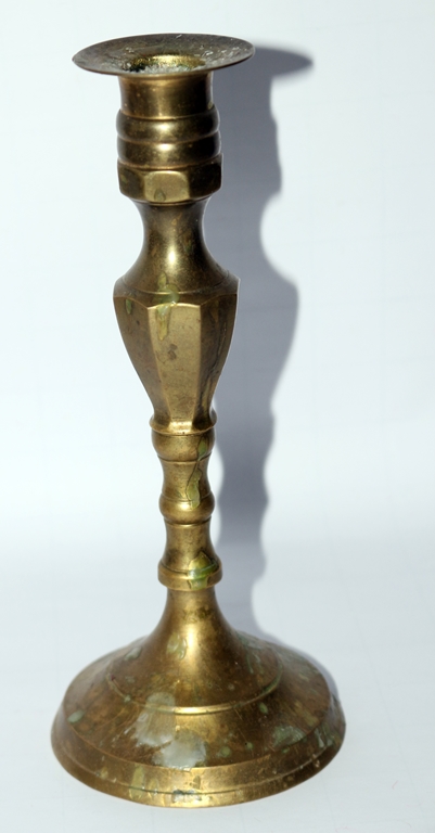 Messing-Kerzenständer mit facettierter, sechseckiger Säule und einem ausgestellten, runden Fuß. Höhe 21,0 cm; Dm oben 4,7; unten 9,0 cm, Klebeschild im Boden: SKG, Made in India