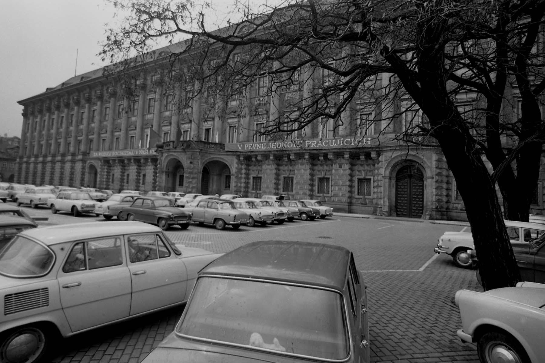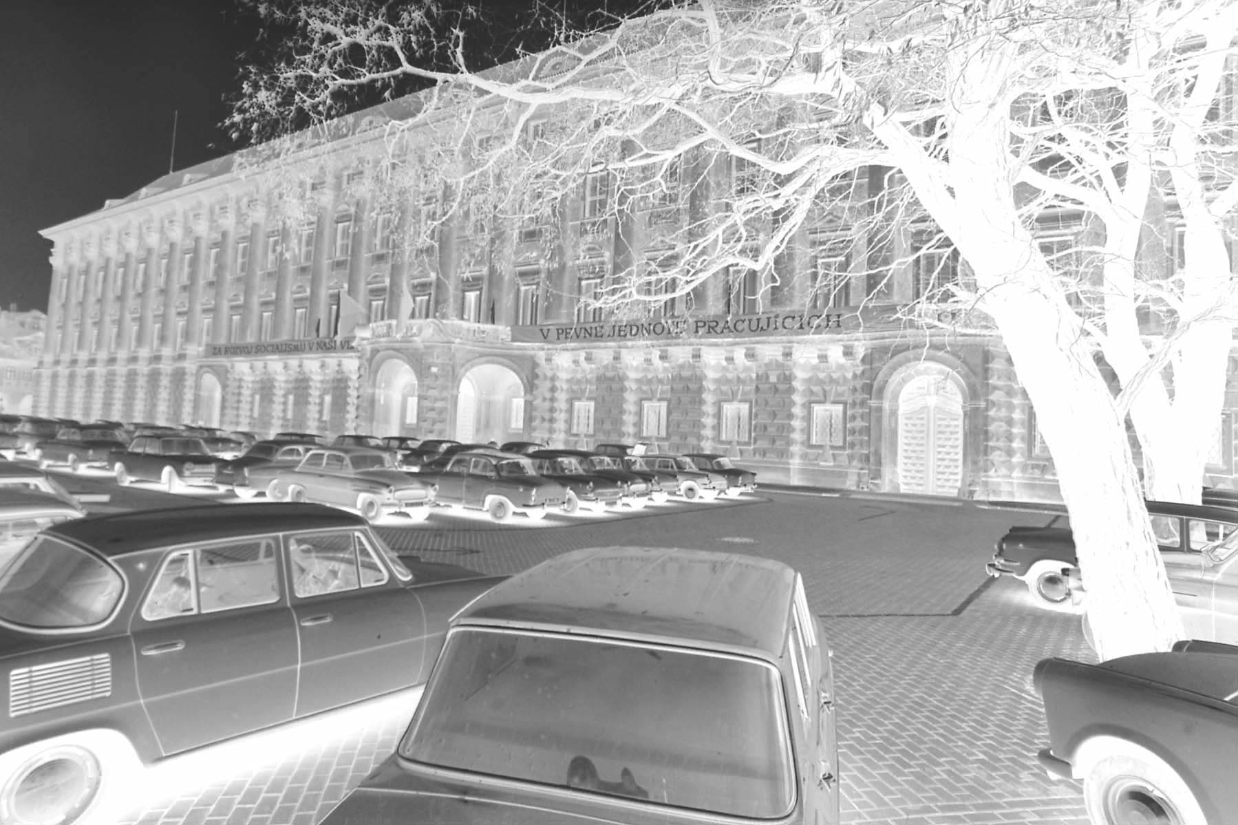 Original - Negativ, s/w, Kleinbild, ?ernín-Palast in Prag, aufgenommen zu einer Zeit, als die Aufschrift „V PEVNE JEDNOYS PRACUJICICH“ (In fester Einheit der Werktätigen) angebracht war. Vordergrund parkende Autos