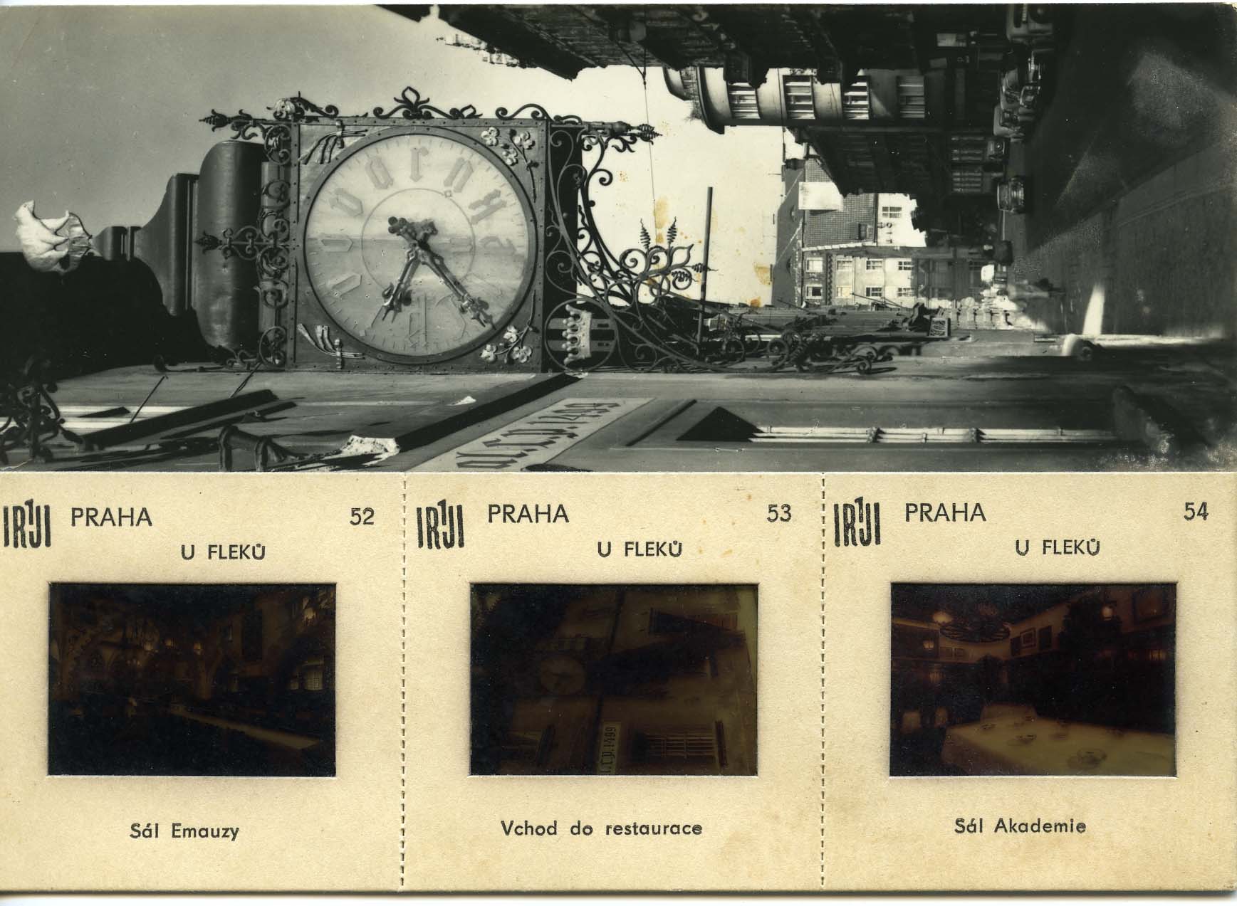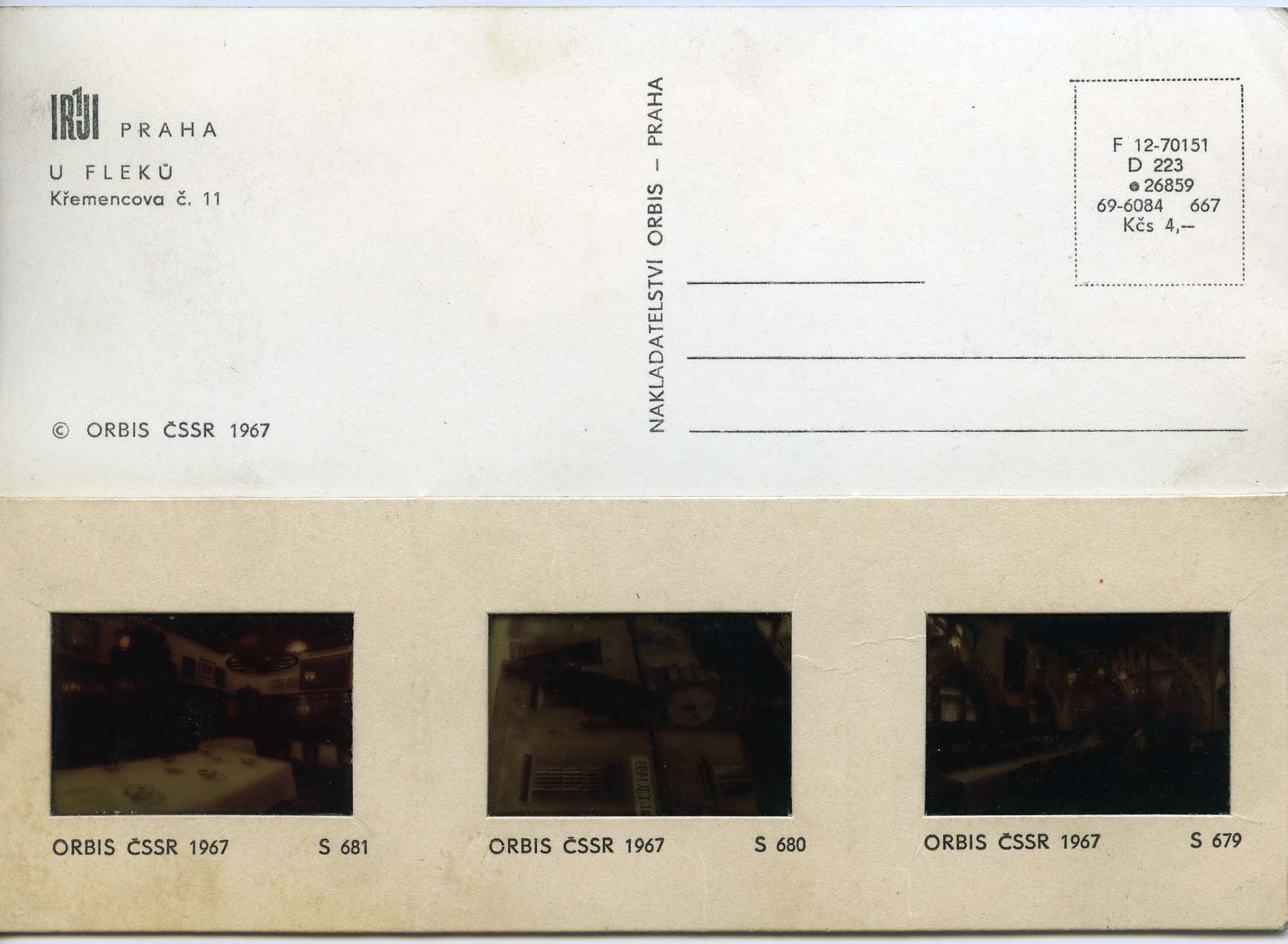 AK/Postkarte Prag, Gaststätte U Flek? ist ein im Jahre 1499 gegründetes und heute eher touristisches Prager Brauhaus in der Prager Neustadt, K?emencova 11 Wahrzeichen ist die draußen hängende Uhr, mit 3 Dias, ungelaufen, ohne Briefmarke und ohne Stempel, Orbis CSSR, Maße 10,8 x 14,9 cm
