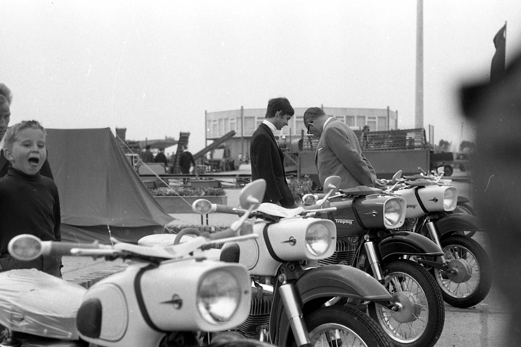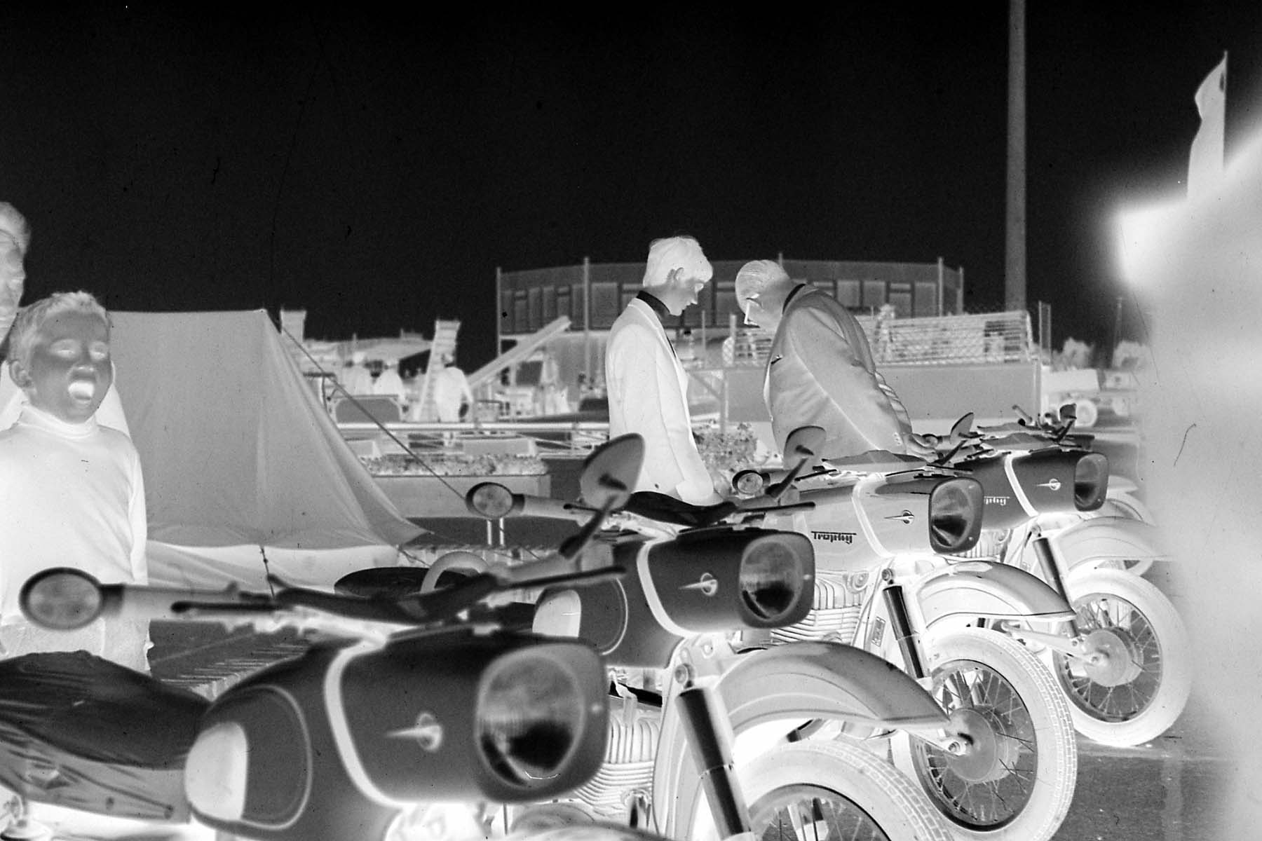 Original - Negativ, s/w, Kleinbild, Ostseewoche in Rostock mit ausgestellten MZ-Motorrädern, ES Baureihe (Einzylinder-Motor und Schwingenfahrwerk), aus Zschopau und das Modell "Trophy" sowie Besuchern
