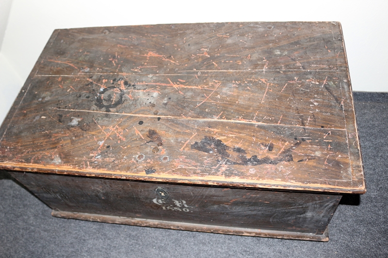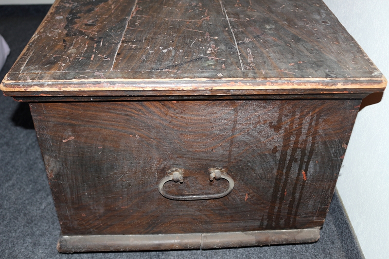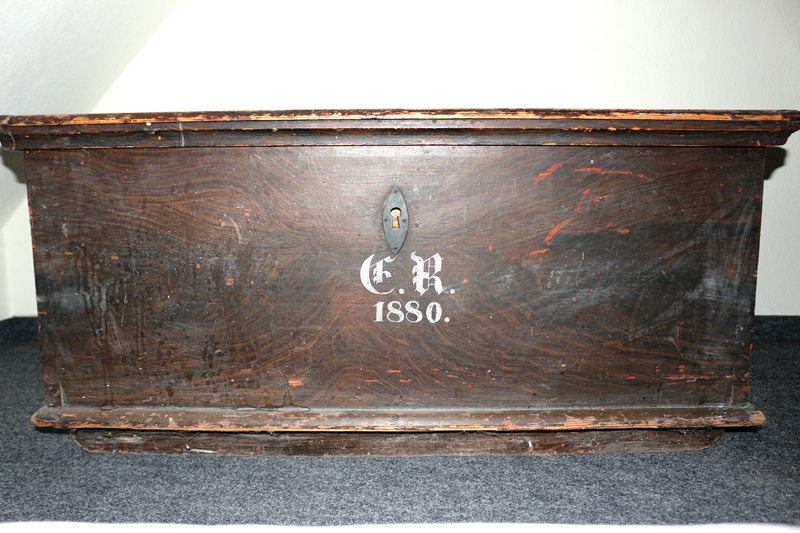 Antike, rustikale Holztruhe, die Truhe weist auf der Vorderseite Initialen („C.R.“) und die Jahreszahl „1880.“ auf. Material: Kiefernholz, (Kienholz), aufgemalte Holzstruktur, einfacher, rustikaler Bauernhausstil, originales Schloss und Schlüssel, Eisengriffe, Höhe 44,5 cm, Breite: 96,5 cm; Tiefe 59,5 cm