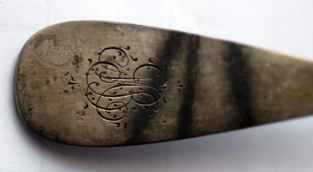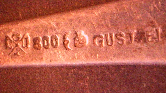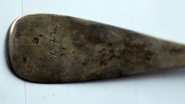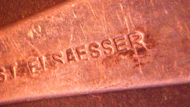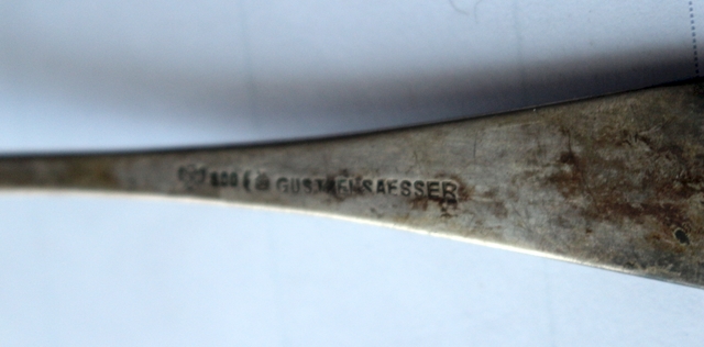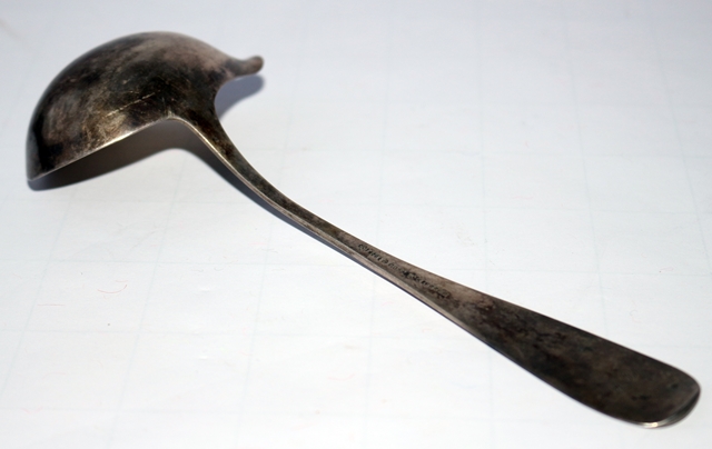 Saucenkelle 800er Silber, Halbmond und Krone, rechts Name des Händlers Gust. (Gustav) Elsaesser, aus Halle a.S., links Meistermarke, Monogramme auf dem Stiel, Rückseite A.B. für Anna Berger 1831 - 1918, Vorderseite B für Berger, Vorname nicht erkennbar, Länge 17,5 cm; Breite Schöpfteil 7,0 x 4,5 cm, 38 g