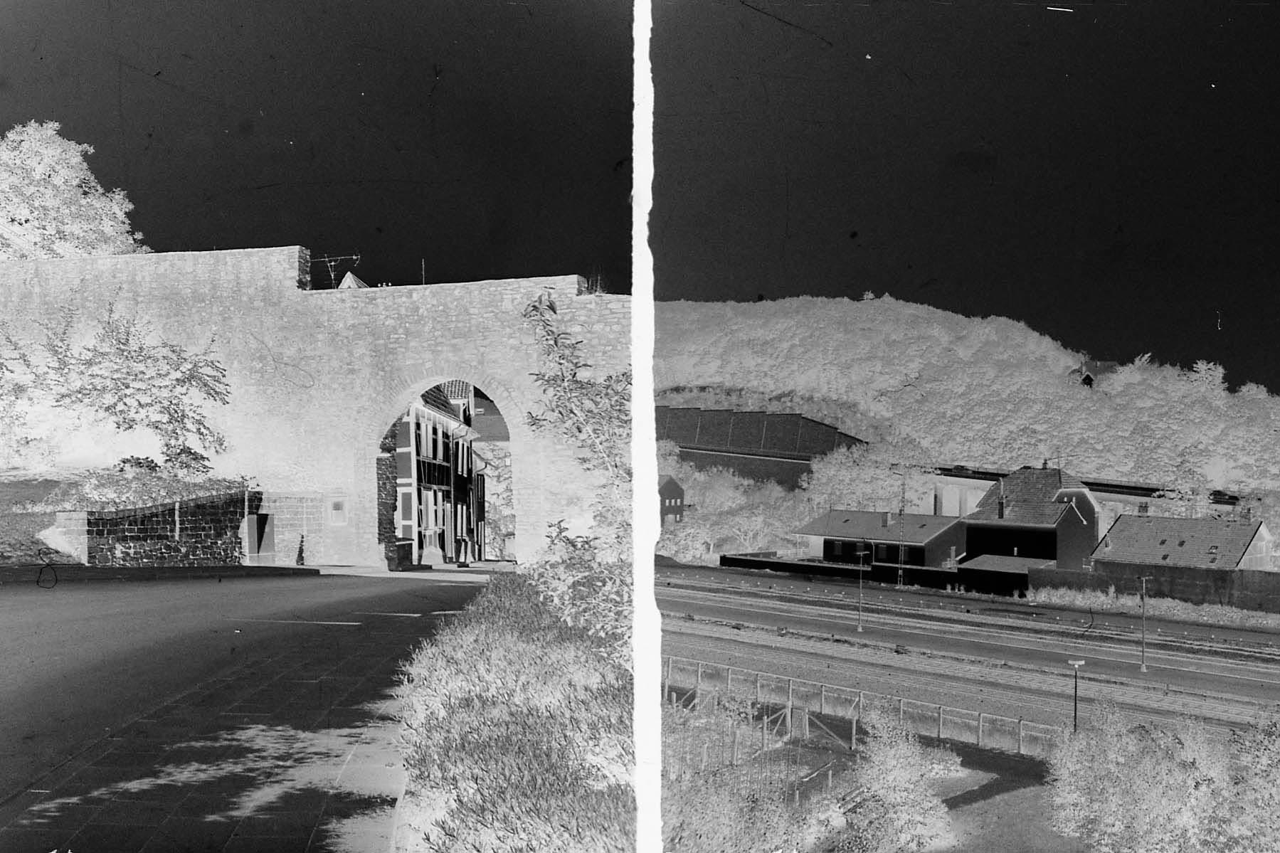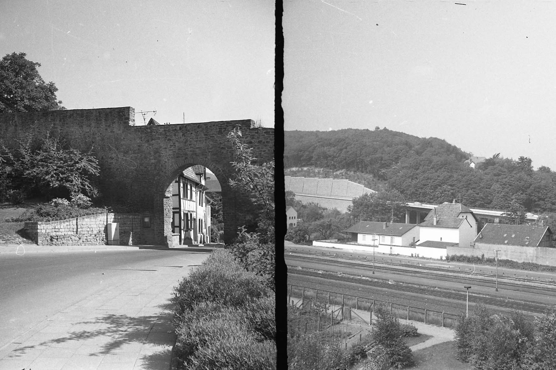 Original - Negativ, s/w, Kleinbild, 2 Aufnahmen: das Rote Tor in Stadtroda, Thüringen, rechts Blick auf die Bahnanlagen und den bewaldeten Roda-Berg im Hintergrund.