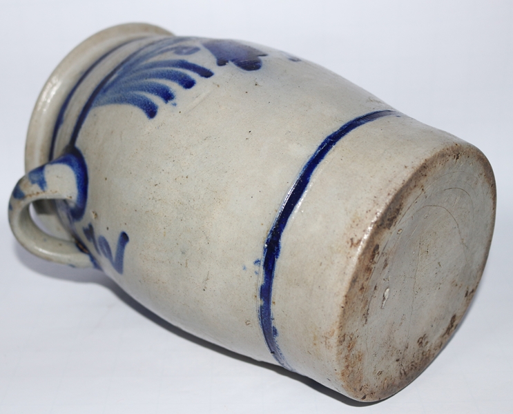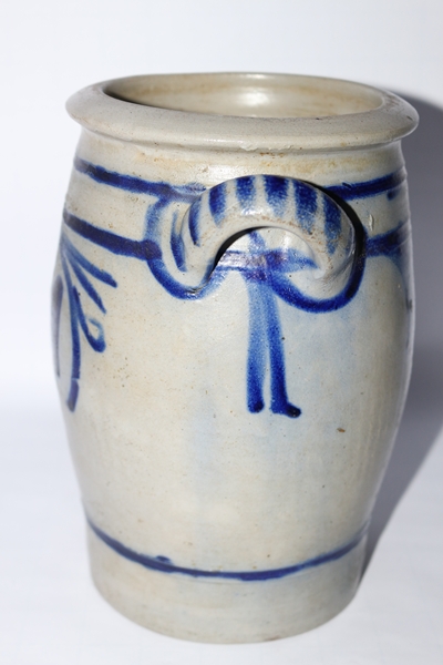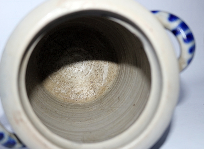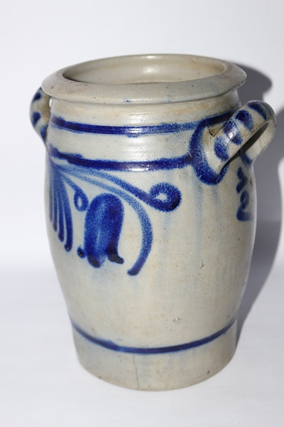 Salzglasierter Steinzeugtopf, möglicherweise aus dem Westerwald, mit Kobaltblau-Verzierung. Handbemalte Kobaltblau-Motive, darunter ein Glockenblumen-ähnliches Muster, und zwei seitliche Henkel. Maße Höhe 22,0 cm; Breite von Griff zu Griff 19,0 cm; Dm Innenöffnung 10,7 cm, außen 14,0 cm, Dm Fuß 12,5 cm