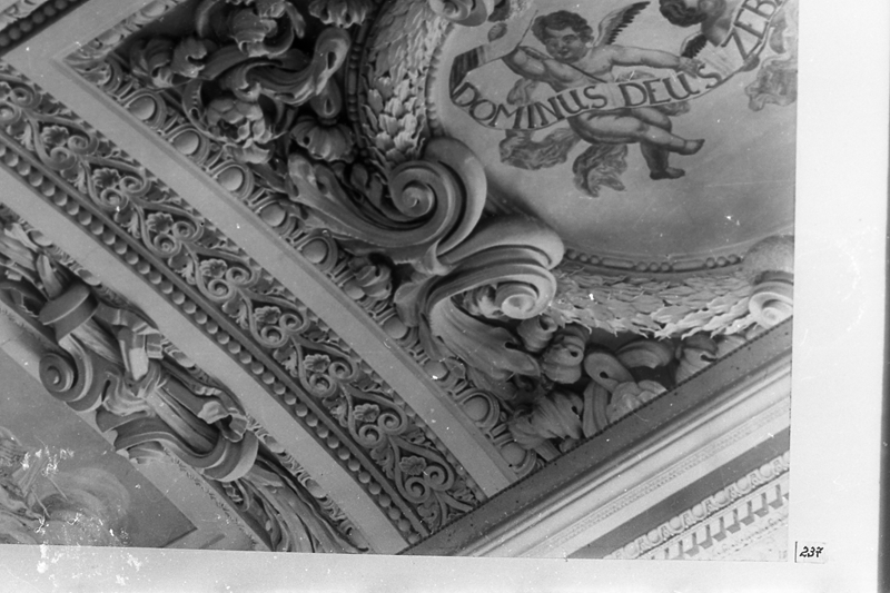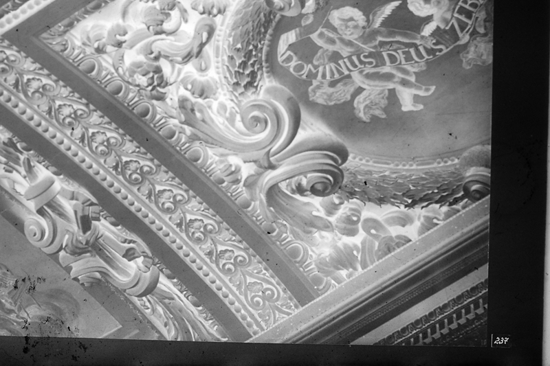 Original - Negativ, s/w, Kleinbild, Reproduktion, Stuckdetails an der Decke des Magistrats-Sitzungssaals im Kneiphöfischen Rathaus in Königsberg. Ein gemaltes Detail zeigt einen Putto, der ein Band mit dem lateinischen Text "DOMINUS DEUS" (Herr Gott) hält. Das Rathaus wurde im April 1945 während des Zweiten Weltkriegs weitgehend zerstört.
