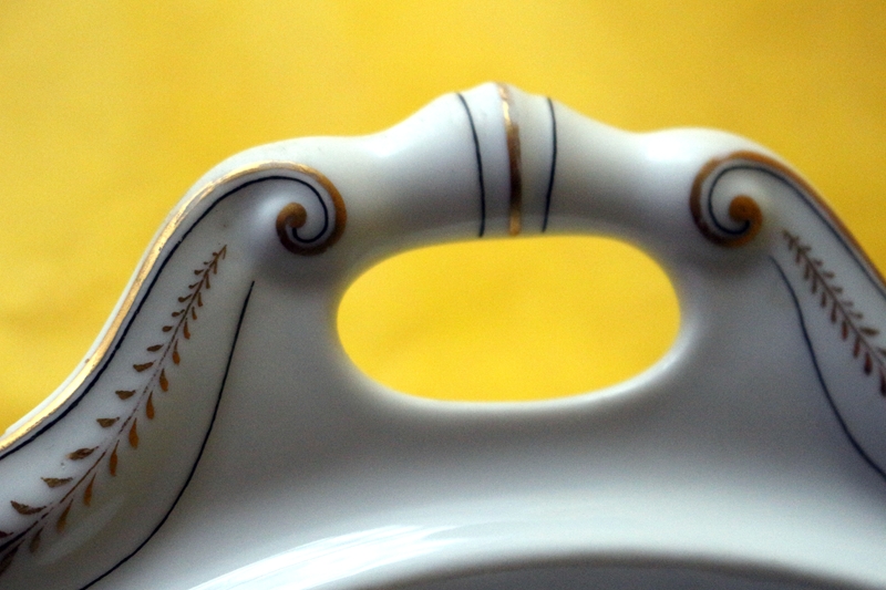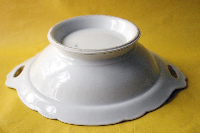 Porzellanschale, wohl der Marke "Haas & Czjzek" um 1880, keine Marke aber die Herstellungsnummer farbig auf Glasur, weißes Porzellan mit glänzender Glasur, verfügt über einen Fuß (Stellring auf der Unterseite), einen gewellten Rand und zwei seitlichen Griffen. Oberer Rand leichter Goldrand und ein ornamentales Muster. Maße H: 8,0; Durchmesser oben mit Henkeln: 31,0 cm; Fuß: 14,5 cm,