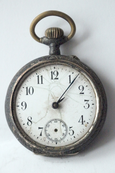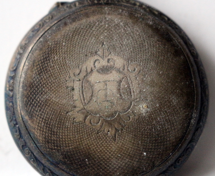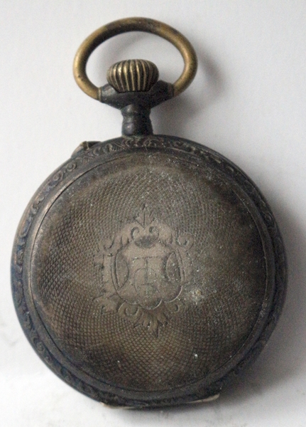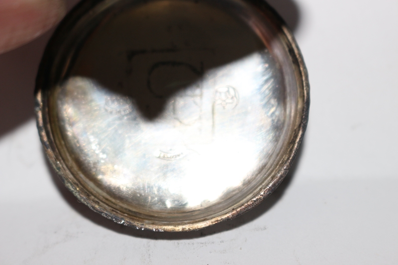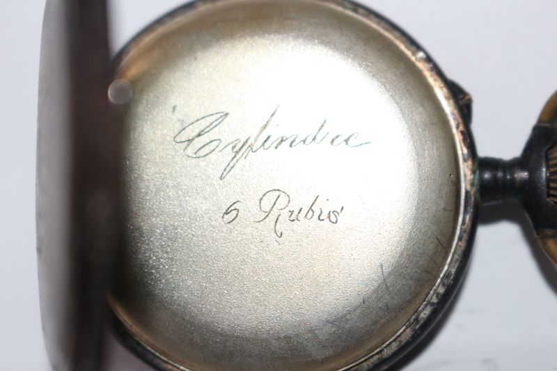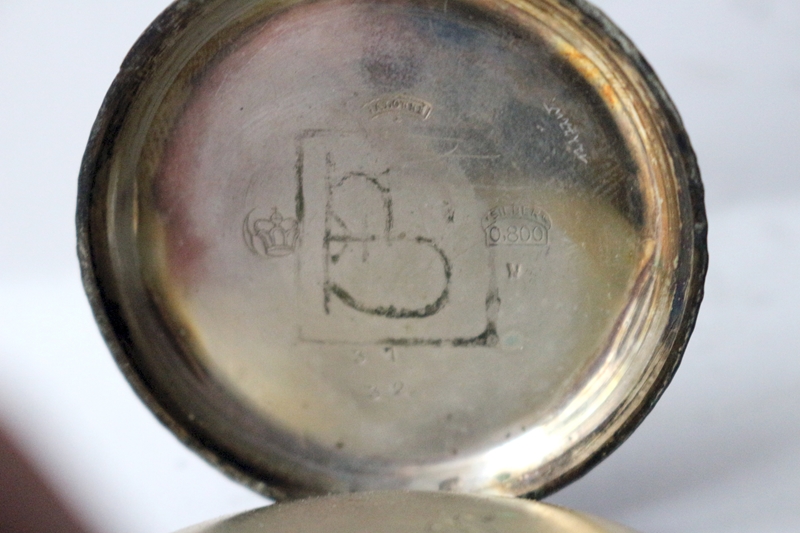 Taschenuhr, Gehäuse 800er Silber, mit Marke Deckel innen: Die Punzierung "0.800", Gehäuse aus 800er Silber, darunter ev. Krone, ist eine Schweizer Silberpunze, im Deckel mittig Halbmond und Krone für Silberzeichen in Deutschland. Der Halbmond steht für Silber, die Krone für die Reichskrone. unten Nummer: "31" und "32", das große, stilisierte "B" in einem Quadrat ist wahrscheinlich das Besitzerzeichen, innerer Deckel: Cylindre 6 Rubis, emailliertes Zifferblatt mit arabischen Ziffern und ein kleine Sekundenzifferblatt bei 6 Uhr. Das Zifferblatt weist deutliche Risse auf und Abnutzungsspuren auf. Der Sekundenzeiger fehlt, ohne Glas, Gesamtgewicht 63,0 g